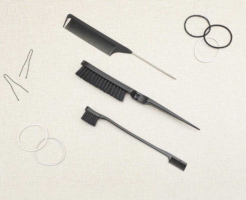 1 peine con punta de 21 cm • 1 cepillo con peine pequeño de 17 cm • 1 cepillo de 21 cm • Esenciales para peinar, separar, alisar y dar volumen • Peine con punta fina para dividir el cabello • Brocha para aplicar tintes • Negro • Plástico
