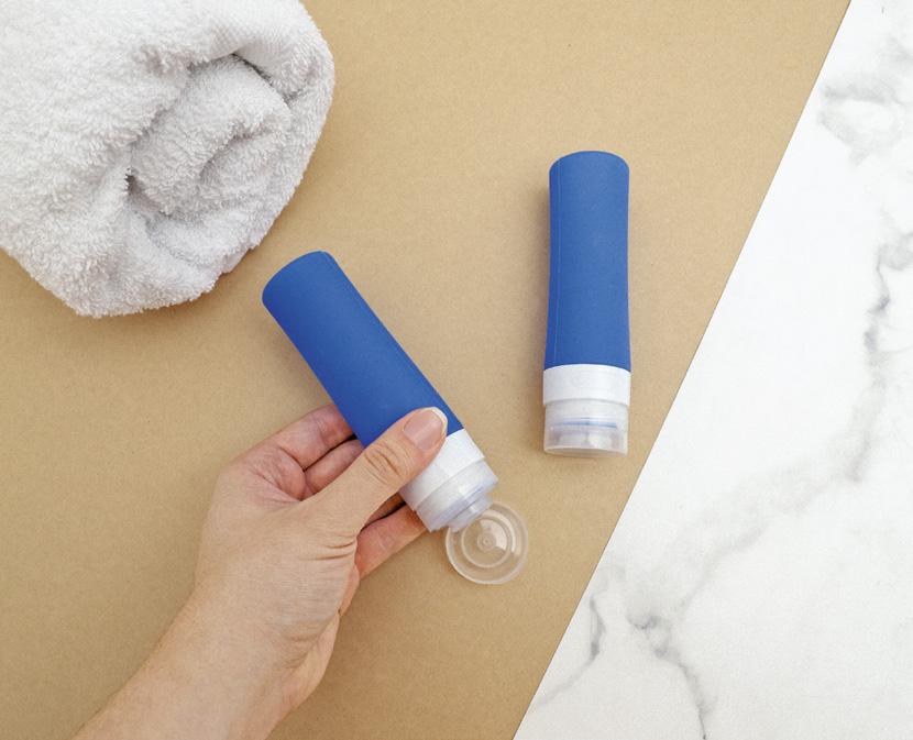 Boquilla antigoteo y tapa segura • Prácticas, ligeras y reutilizables • Cumple con regulaciones de viaje en avión • Azul • Silicón • 3 x 13 cm (100 ml)