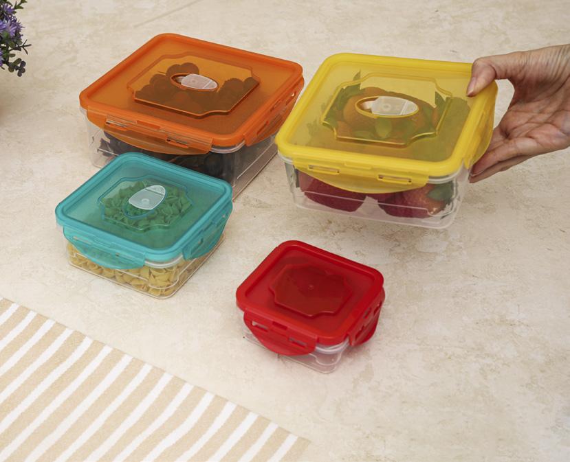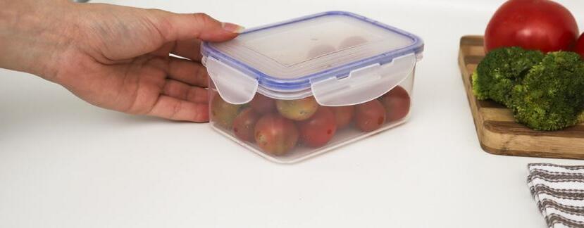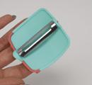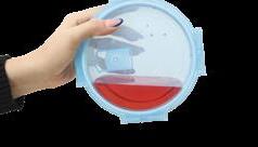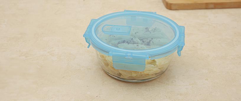 Transparente con silicón azul • Plástico y silicón • 1 recipiente de 11 cm de ancho x 17 cm de largo x 7 cm de alto (700 ml) • 1 recipiente de 7 cm de ancho x 10 cm de largo x 4 cm de alto (150 ml)