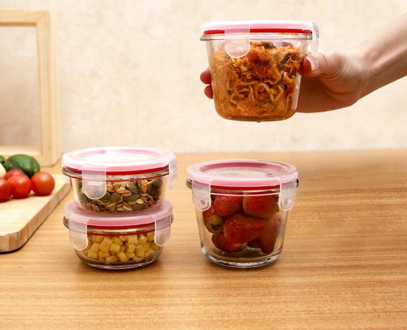Tapas con cierres de clip • Rojo • Vidrio refractario y plástico • 2 mini refractarios de 5 cm de alto x 9 cm de diámetro (100 ml) • 2 mini refractarios de 8 cm de alto x 9 cm de diámetro (200 ml)