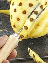 • Extrae los puntos negros de la piña • Plateado con amarillo y beige • Acero inoxidable, madera y plástico • 1 pelador de 16 cm de largo • 1 cortador de centros de 23 cm de largo • 1 cortador de 10 cm de diámetro