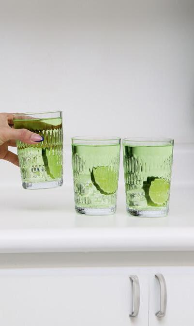 Transparente con verde, rosado y beige • Vidrio y bambú • 3 recipientes con tapa de 8 cm de alto x 8 cm de diámetro (250 ml) • 3 cucharas de 13 cm de largo • 1 base de 10 cm de ancho x 28 cm de largo