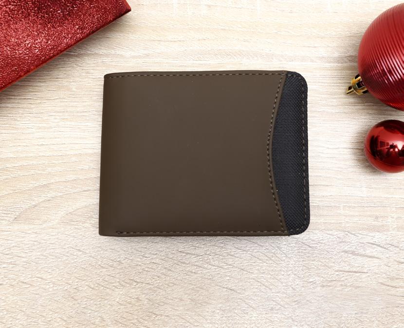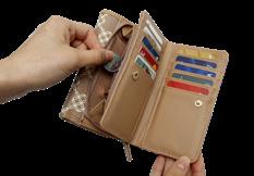 Cierre principal con broche en ambos lados • Con monedero y múltiples compartimentos para tarjetas y billetes • Beige • Cuero y poliéster • 9 cm de ancho x 15 cm de largo x 4 cm de alto