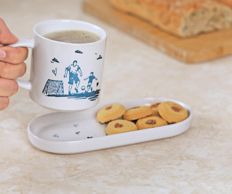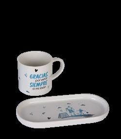 Blanco con azul • Cerámica • 1 taza de 8 cm de alto x 8 cm de diámetro (250 ml) • 1 plato de 9 cm de ancho x 21 cm de largo