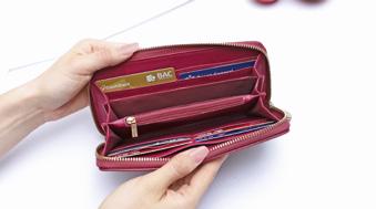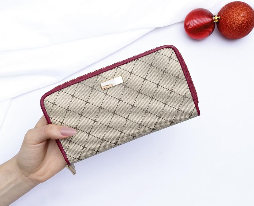 Cierre principal con zipper • Múltiples compartimentos para tarjetas y billetes y monedero • Beige con rojo • Imitación de cuero y poliéster