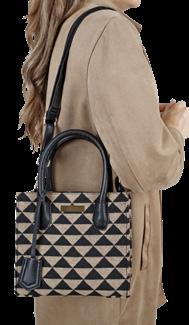 Cierre principal con zipper • Tres compartimentos internos, uno con zipper • Correa ajustable y desprendible • Beige con negro Cuero y poliéster • 10 cm de ancho x 22 cm de largo x 31 cm de alto, (correa de 120 cm de largo)