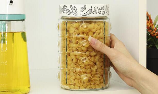 Tapa de cierre a presión • Con hule en la tapa que impide la entrada de insectos • Transparente con tapa beige • Vidrio, bambú y hule • 800 ml • 14 cm de alto x 10 cm de diámetro