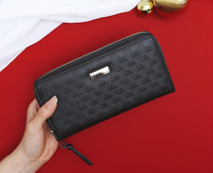 Cierre principal con zipper y broche • Múltiples compartimentos para tarjetas, billetes y monedero • Negro • Imitación de cuero • 10 cm de ancho x 20 cm de largo