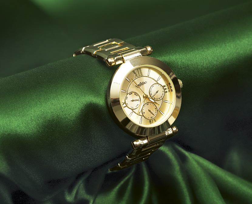 Cierre de clip • Esferas decorativas • Dorado • Aleación con baño de oro y acero inoxidable • Carátula: 4 cm de diámetro • Brazalete: 13 cm de largo
