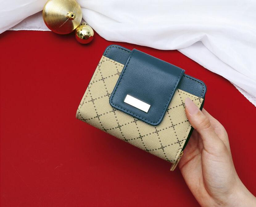 Cierre principal con broche • Con múltiples compartimentos para tarjetas, billetes y monedero • Beige con azul petróleo • 10 cm de ancho x 13 cm de largo • Imitación de cuero