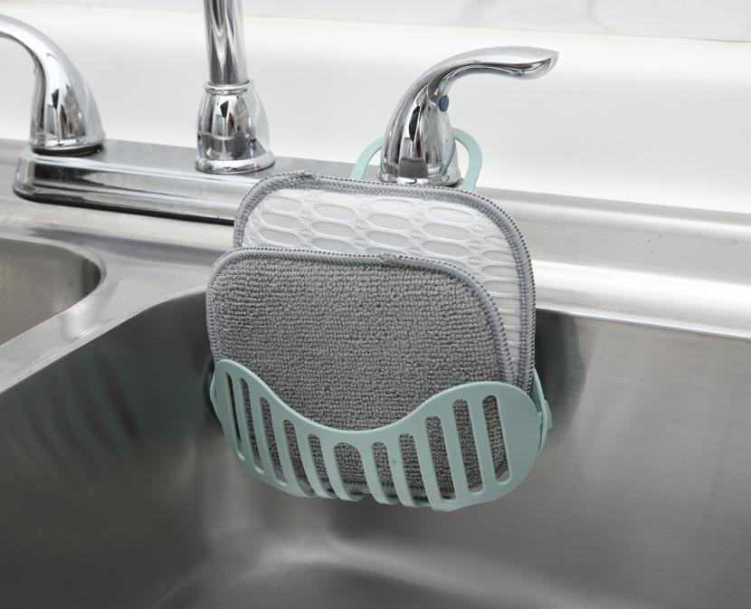 1 porta esponja de 6 x 16 x 19 cm • 2 esponjas de 12 x 15 cm • Esponjas con un lado suave y otro abrasivo • Gris con verde