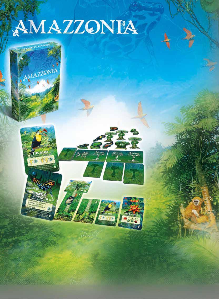 Amazzonia è un gioco di carte per 2 giocatori, giocabile anche in solitario e fino a 4 giocatori. Durante ogni stagione dovrete scegliere attentamente quali carte aggiungere alla vostra foresta, facendo crescere gli alberi e accogliendo una miriade di piante e animali con potenti effetti e diversi metodi per ottenere punti vittoria. La vostra foresta crescerà turno dopo turno, premiando l’ecosistema più rigoglioso al termine della partita.
