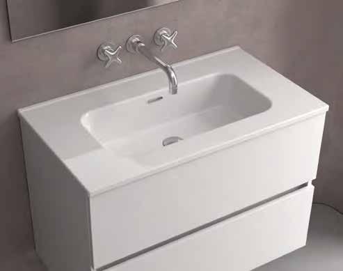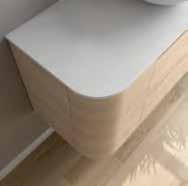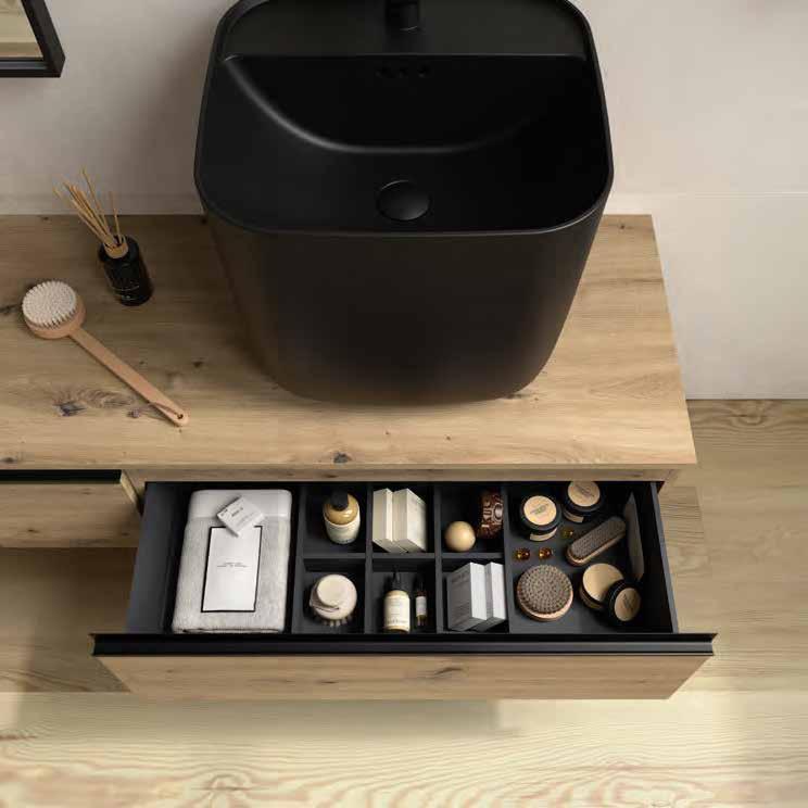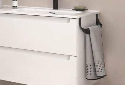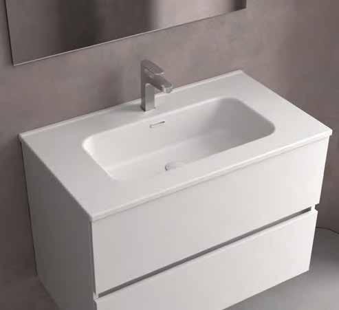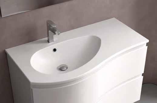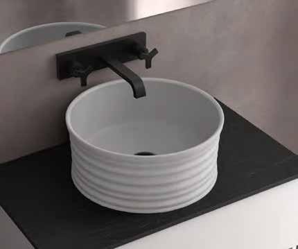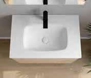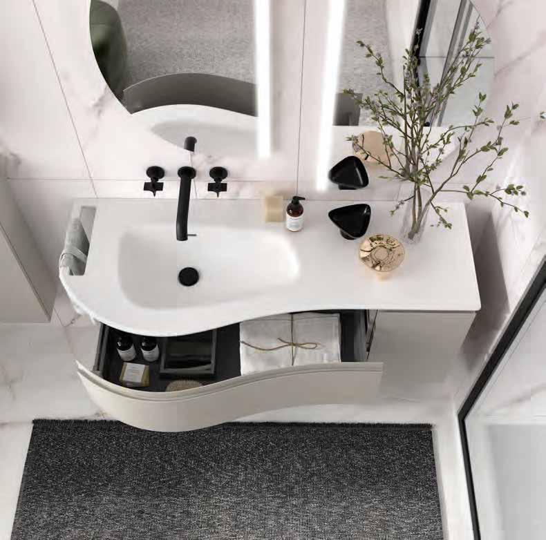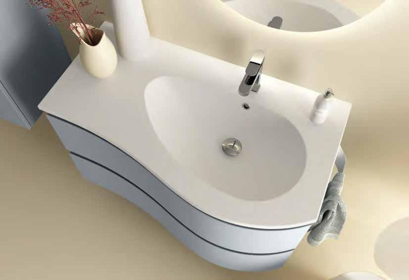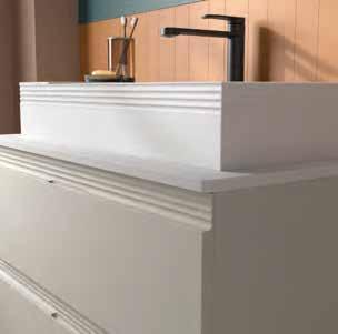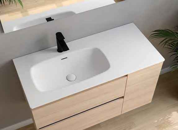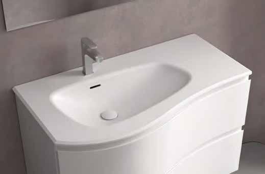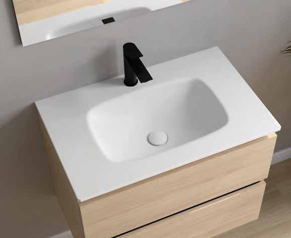 El lavabo Ocean está diseñado con una curvatura interior precisa que guía el agua de forma suave y controlada, evitando salpicaduras. Su geometría, inspirada en el movimiento natural del mar, optimiza el ujo desde el grifo y ofrece una experiencia de uso silenciosa, limpia y armónica. El conjunto se remata con un tirador lineal minimalista, que actúa como línea divisoria entre lo uido y lo sólido.