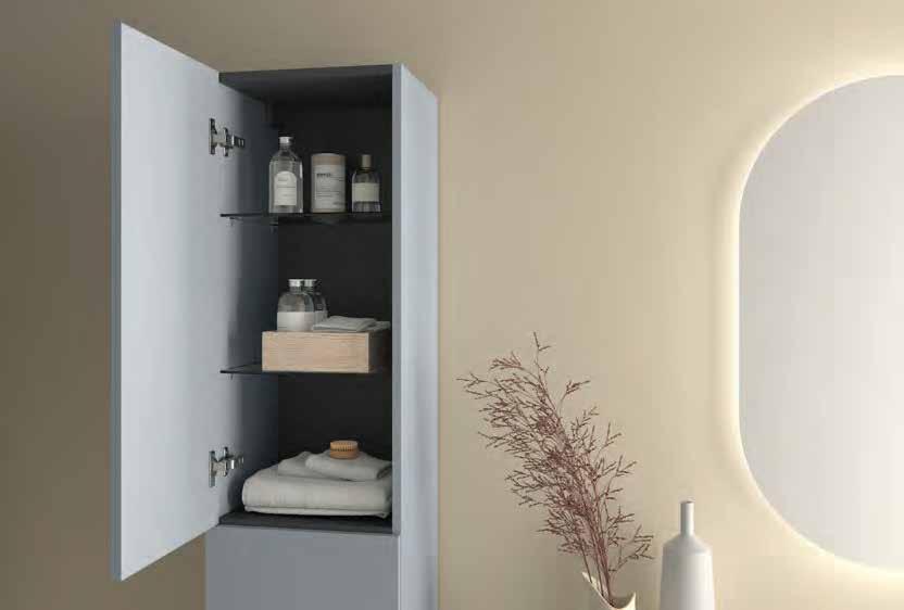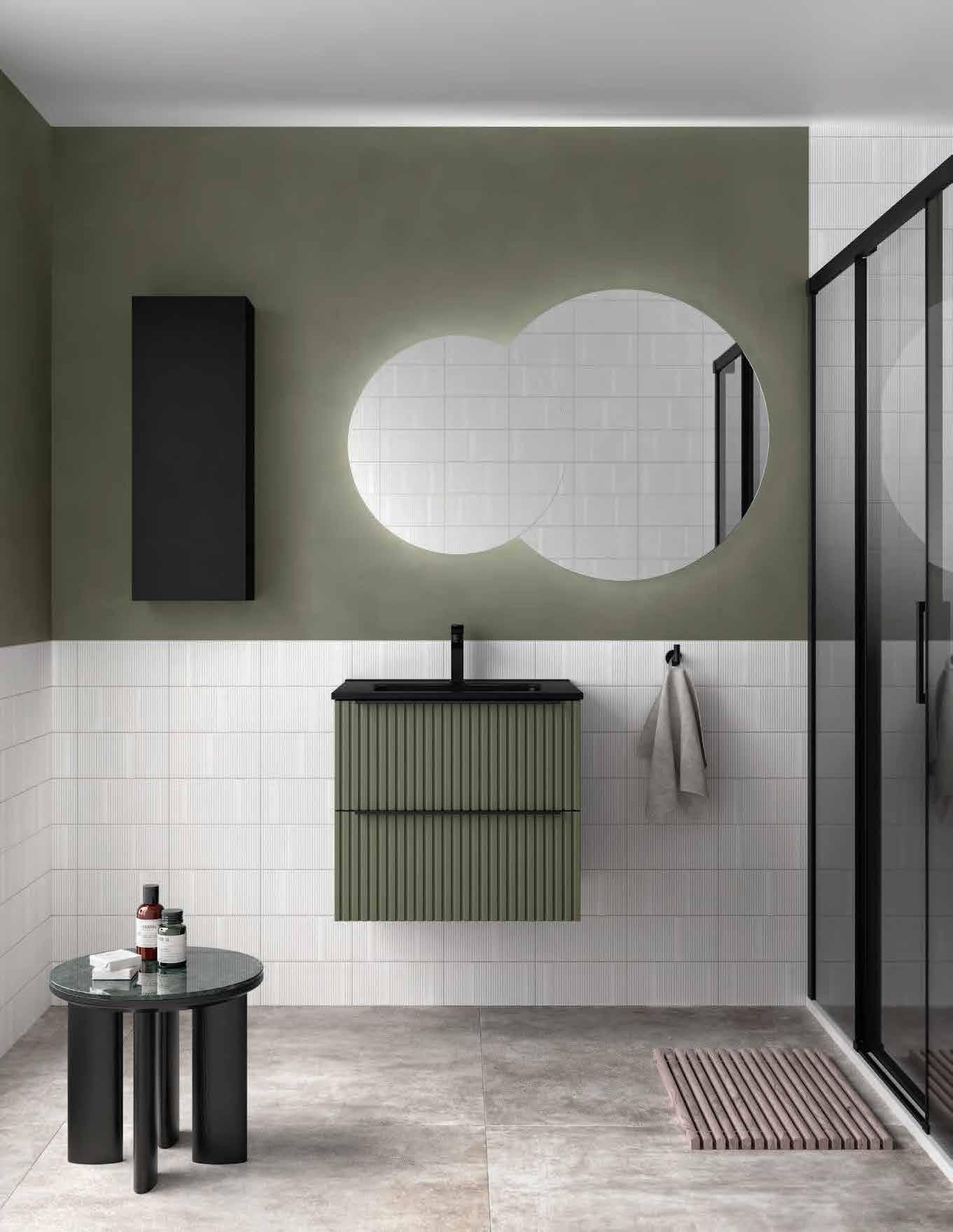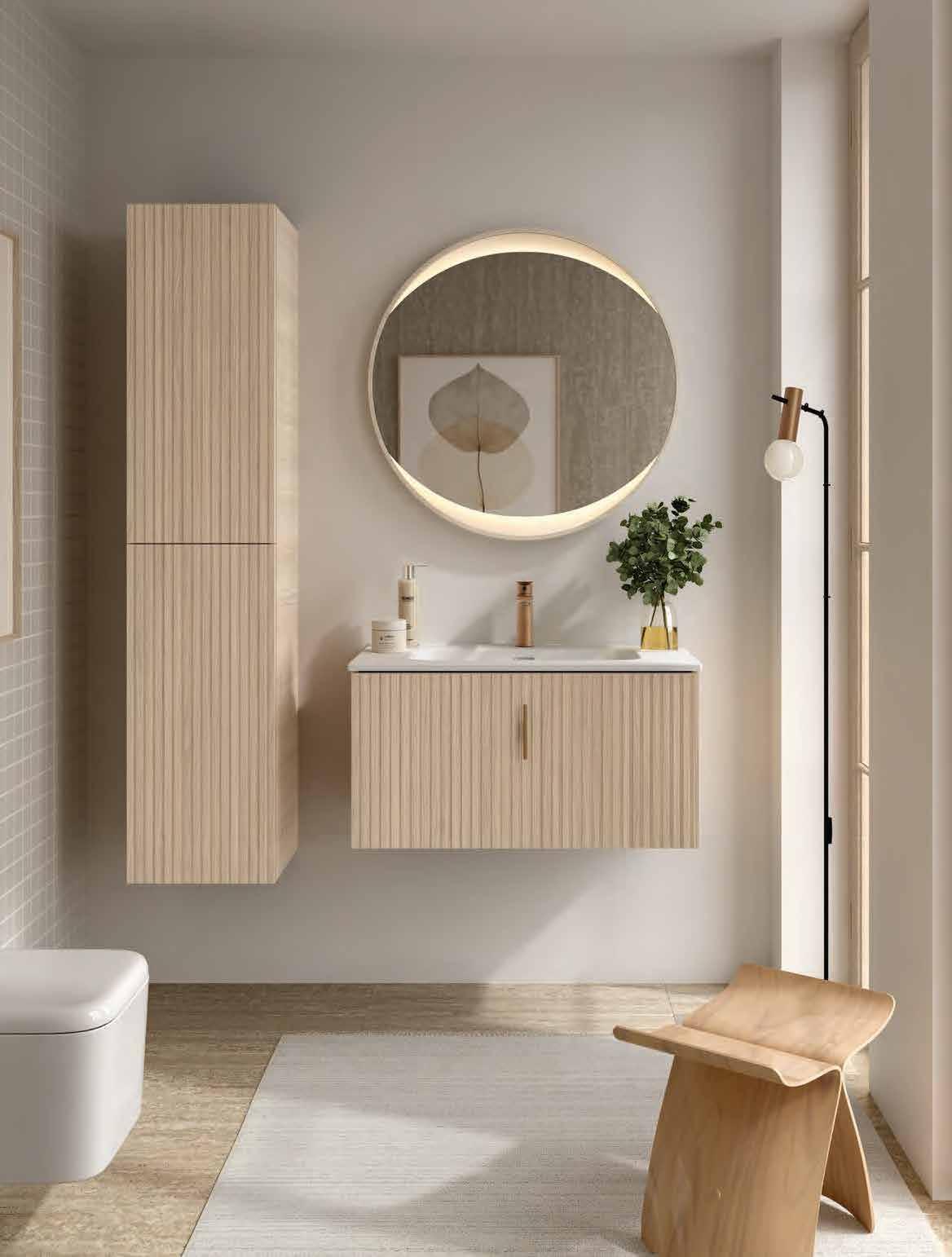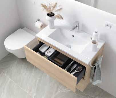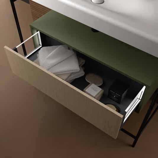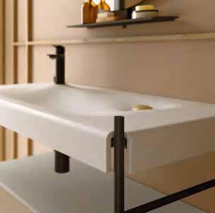 El lavabo Ocean está diseñado con una curvatura interior precisa que guía el agua de forma suave y controlada, evitando salpicaduras. Su geometría, inspirada en el movimiento natural del mar, optimiza el ujo desde el grifo y ofrece una experiencia de uso silenciosa, limpia y armónica. El conjunto se remata con un tirador lineal minimalista, que actúa como línea divisoria entre lo uido y lo sólido.