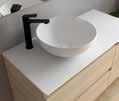 Emma washbasin. Made entirely from Solid Surface, the Emma washbasin adds a sculptural touch that highlights the purity of its forms and the meticulous attention to detail.