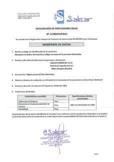 1. Nombre y código de identificación de los productos: Plato Ducha. Descripción y códigos se encuentran en el Anexo de la presente declaración. 2. Tipo, código número de serie otro elemento, el cual identifique el producto de acuerdo con la disposición del Art. 11, párrafo 4: Véase en el Anexo de la presente declaración. 3. Nombre dirección del fabricante o importador o distribuidor de acuerdo con la disposición del Art. 11, párrafo 5: COMERCIAL SALGAR S.L. Autovía de Logroño, Km 9,5 50011 Zaragoza (España)