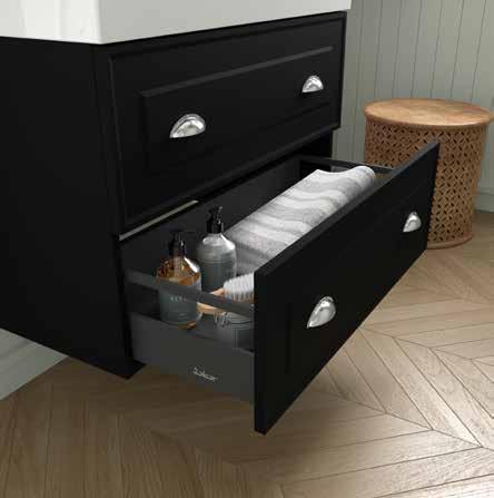 Wall hung vanity with 2 soft close wooden drawers, Hettich runners and interior finish Onix. Drawer organiser and black handles are included.