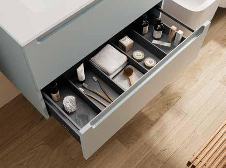 Wall-hung unit with 2 metallic drawers full extension, Onix interior with soft close. Drawer organizer included with 2 removable trays. Handles are not included.
