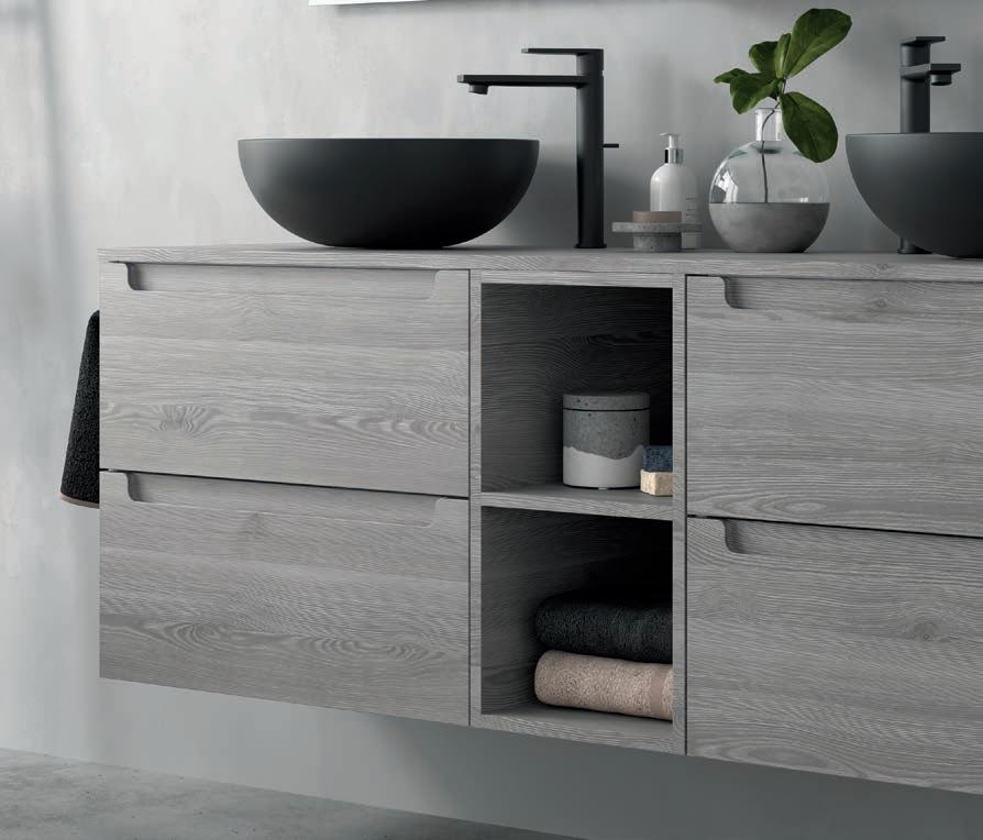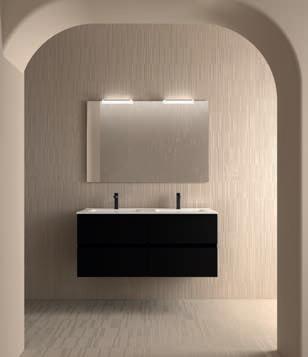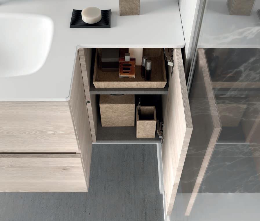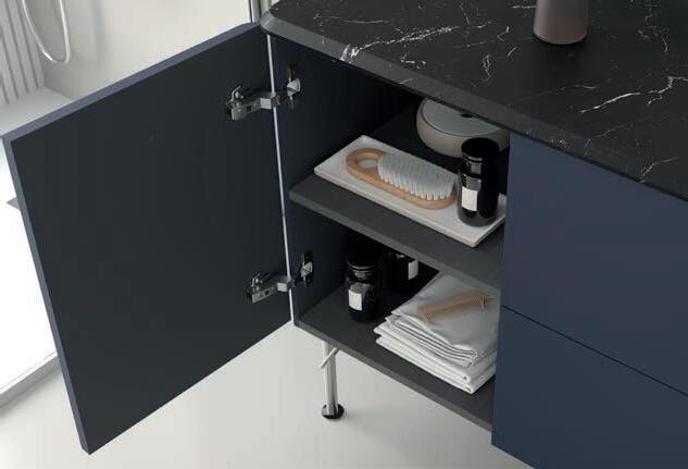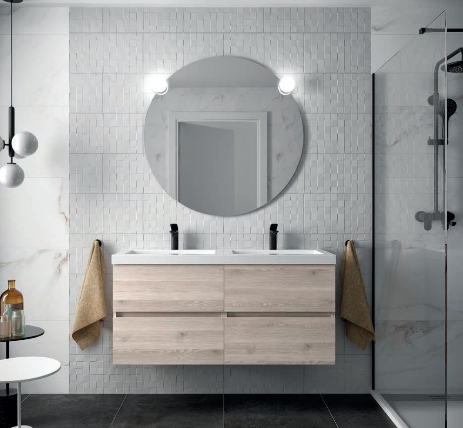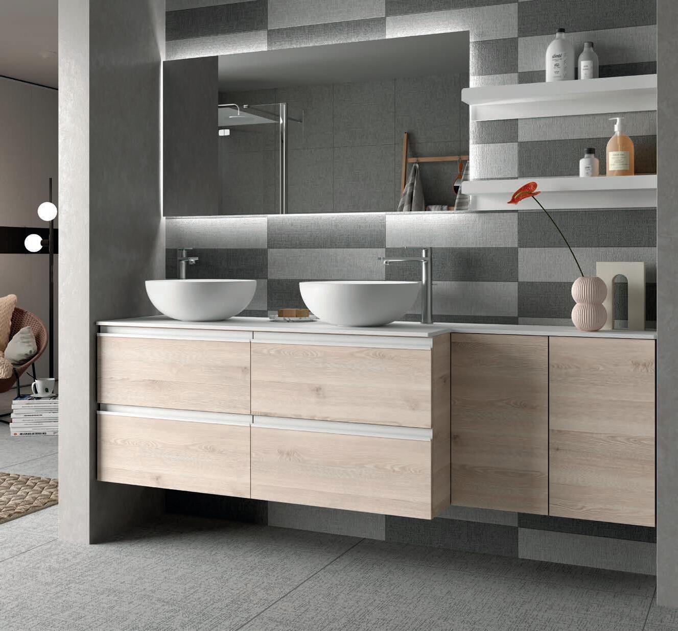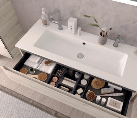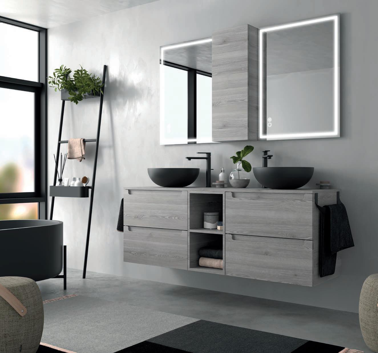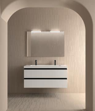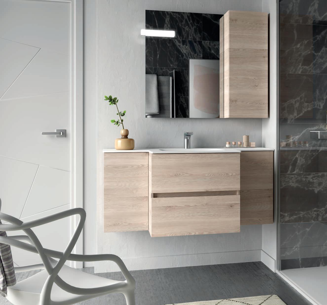Resistant to cleaning products and disinfectants Bespoken Dirt repellent Lock brake Without handle Exterior handle integrated handle Reversible Runners Grass Runners Hettich Spacer included Under sink insert drawer Push system drawers Push system doors Multilayer laminated board Metal drawer Total extraction Extraction plus Wooden drawer MDF board Particle board Natural wood finish Matt lacquer finish Gloss lacquer finish Laminate board finish Boardwith 3D finish No need for drilling Hard-wearing adhesive fixing IP 44 Horizontal/ Vertical Mirror with fixing Low consumption Backlit mirror Work lighting Sensor on/off Sensor antifog Rotating mirror