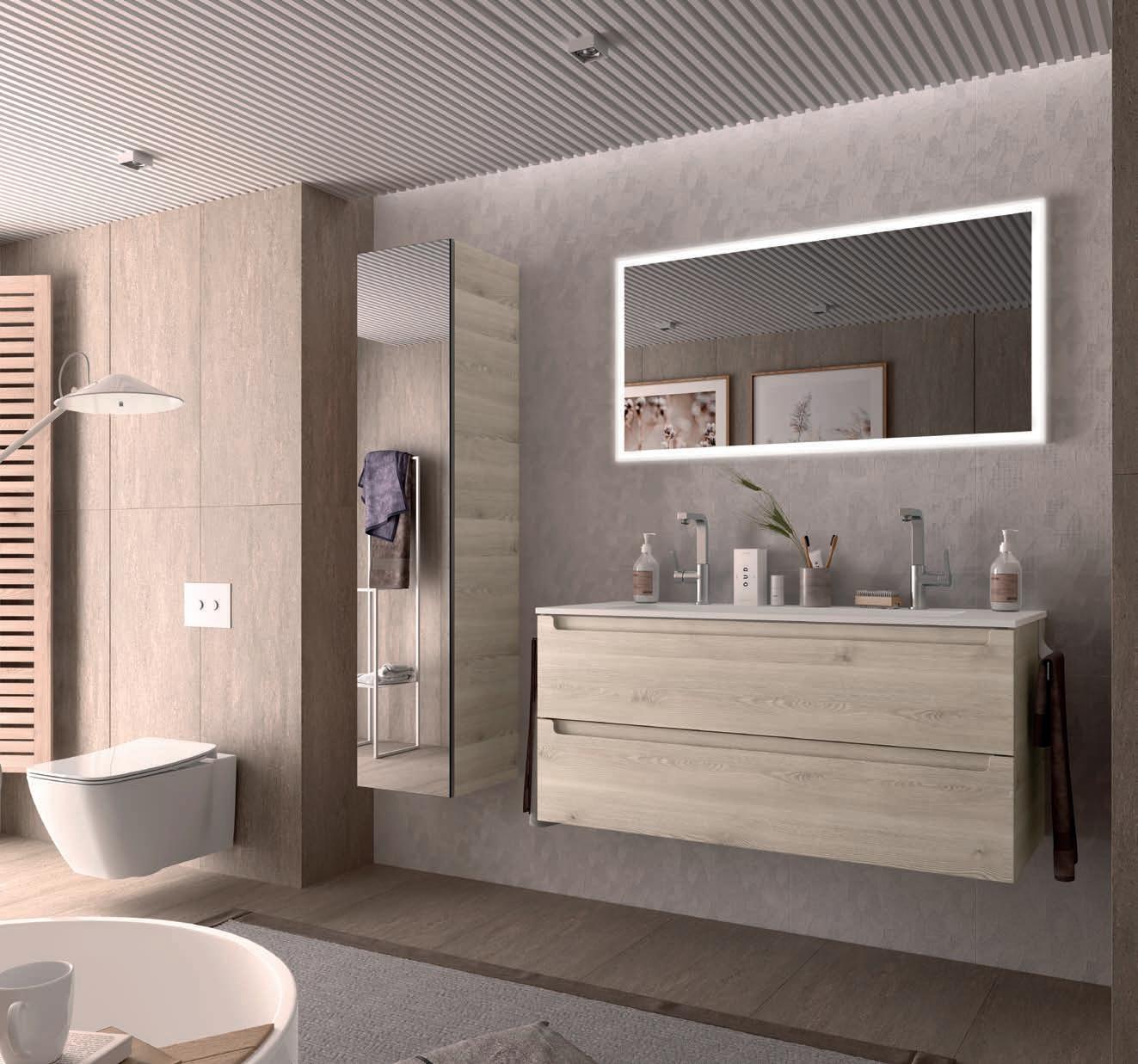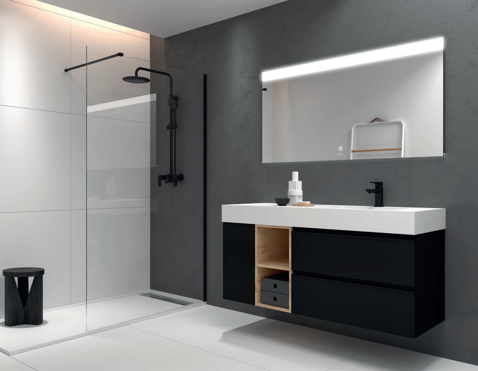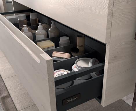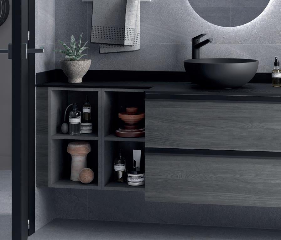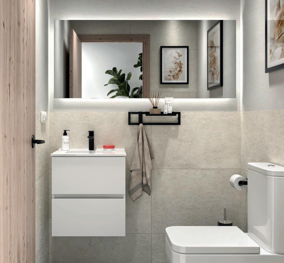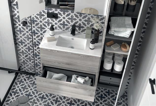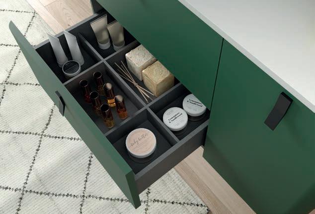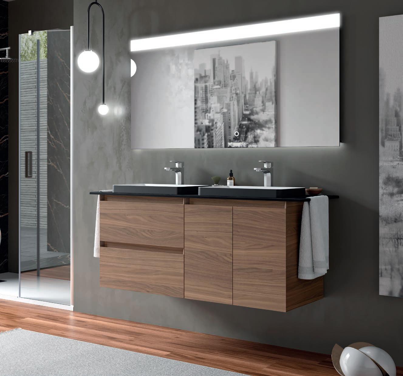 Resistant to cleaning products and disinfectants Bespoken Dirt repellent Lock brake Without handle Exterior handle integrated handle Reversible Runners Grass Runners Hettich Spacer included Under sink insert drawer Push system drawers Push system doors Multilayer laminated board Metal drawer Total extraction Extraction plus Wooden drawer MDF board Particle board Natural wood finish Matt lacquer finish Gloss lacquer finish Laminate board finish Boardwith 3D finish No need for drilling Hard-wearing adhesive fixing IP 44 Horizontal/ Vertical Mirror with fixing Low consumption Backlit mirror Work lighting Sensor on/off Sensor antifog Rotating mirror