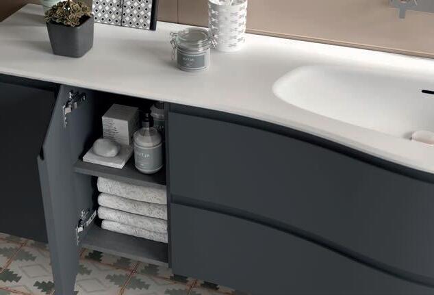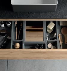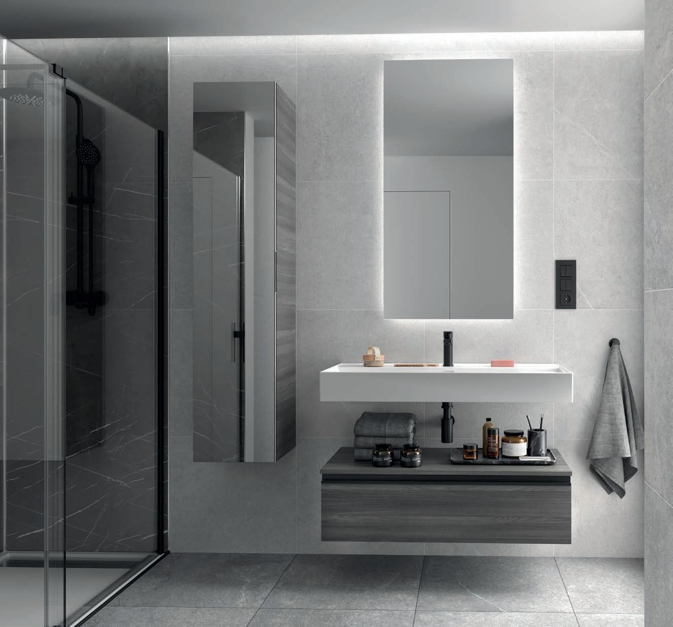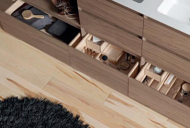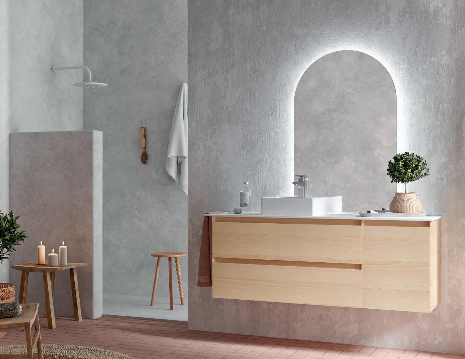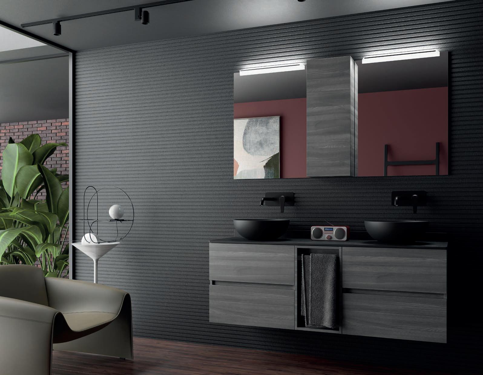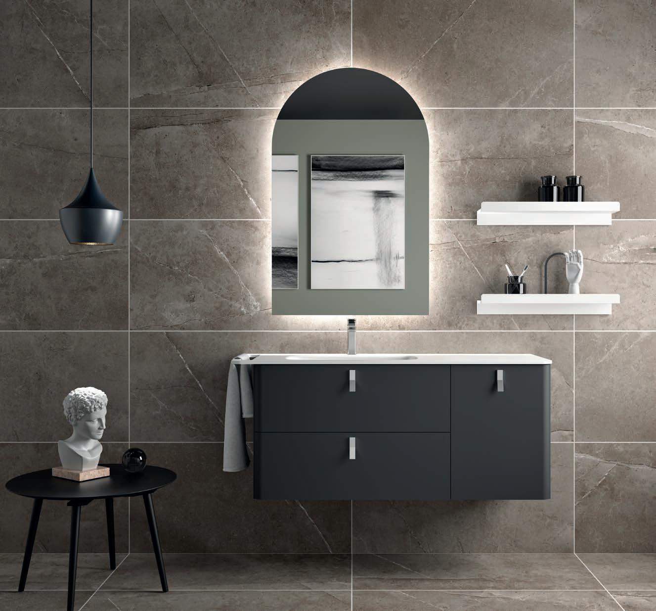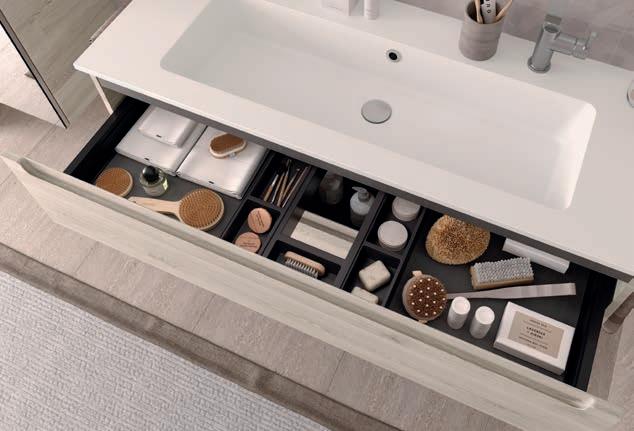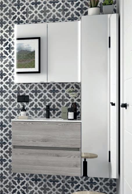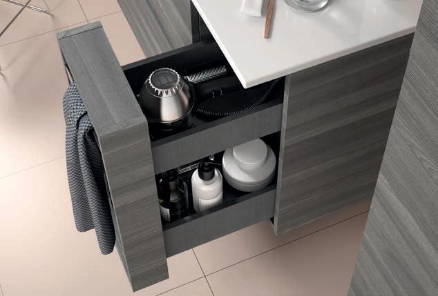 Resistant to cleaning products and disinfectants Bespoken Dirt repellent Lock brake Without handle Exterior handle integrated handle Reversible Runners Grass Runners Hettich Spacer included Under sink insert drawer Push system drawers Push system doors Multilayer laminated board Metal drawer Total extraction Extraction plus Wooden drawer MDF board Particle board Natural wood finish Matt lacquer finish Gloss lacquer finish Laminate board finish Boardwith 3D finish No need for drilling Hard-wearing adhesive fixing IP 44 Horizontal/ Vertical Mirror with fixing Low consumption Backlit mirror Work lighting Sensor on/off Sensor antifog Rotating mirror