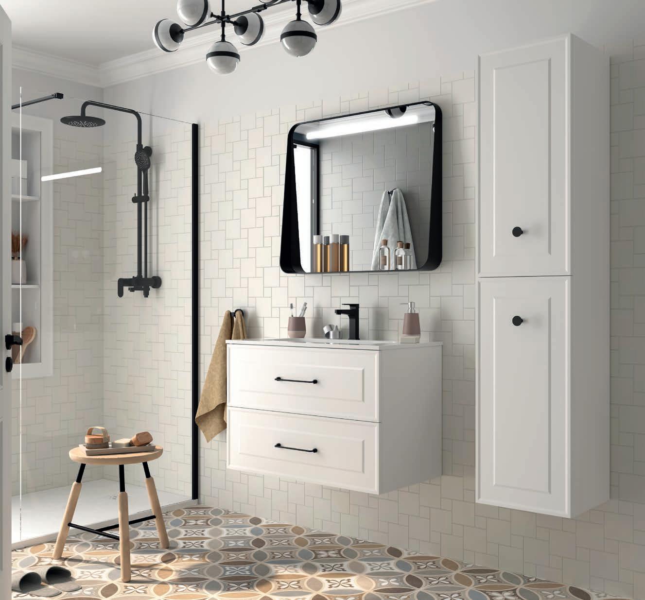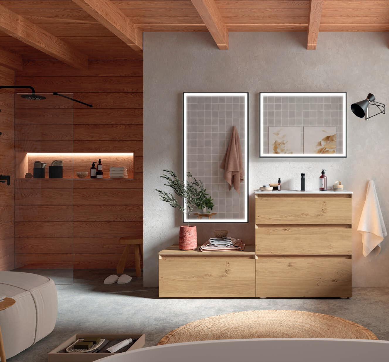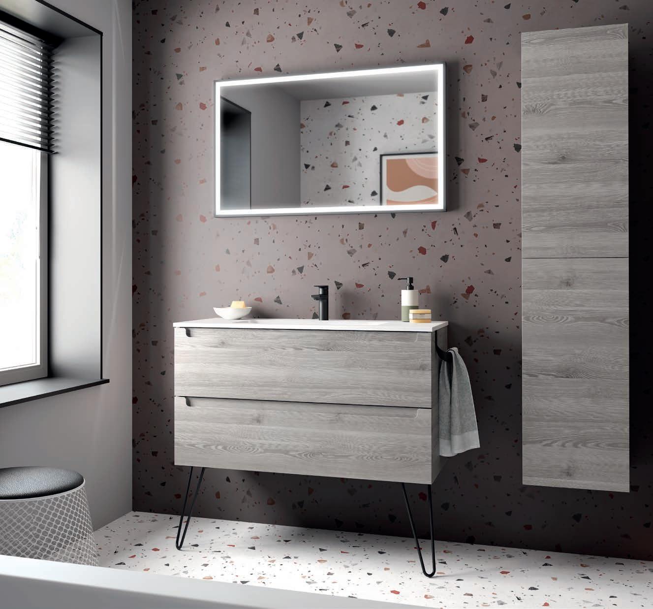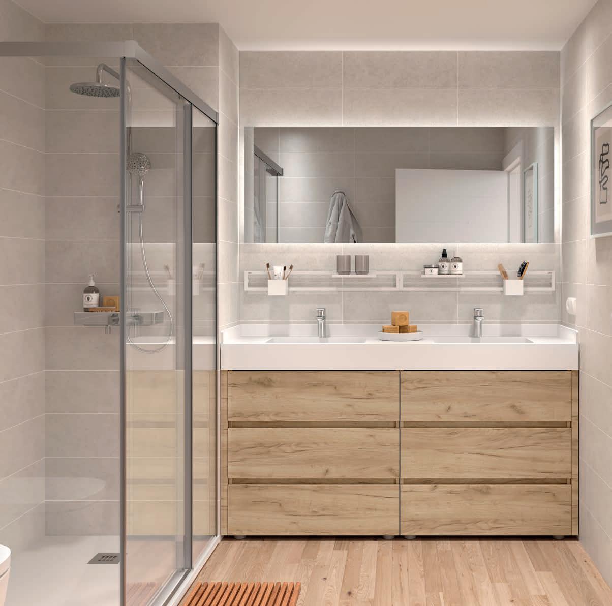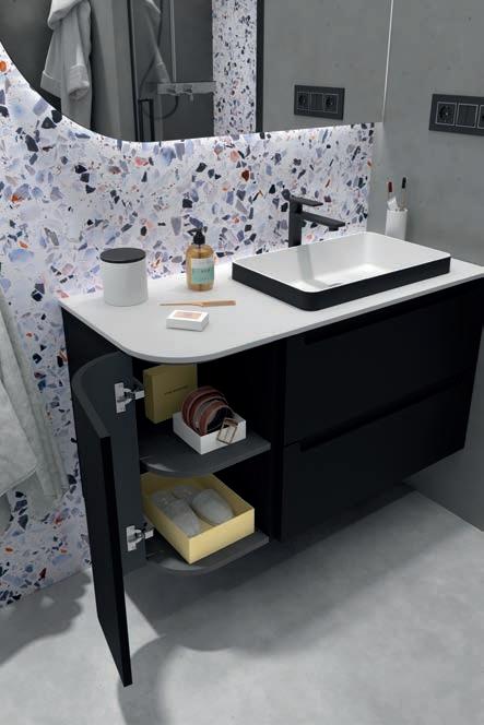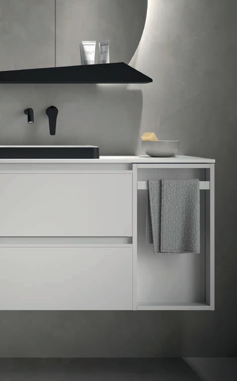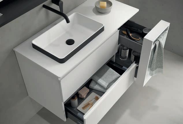 Resistant to cleaning products and disinfectants Bespoken Dirt repellent Lock brake Without handle Exterior handle integrated handle Reversible Runners Grass Runners Hettich Spacer included Under sink insert drawer Push system drawers Push system doors Multilayer laminated board Metal drawer Total extraction Extraction plus Wooden drawer MDF board Particle board Natural wood finish Matt lacquer finish Gloss lacquer finish Laminate board finish Boardwith 3D finish No need for drilling Hard-wearing adhesive fixing IP 44 Horizontal/ Vertical Mirror with fixing Low consumption Backlit mirror Work lighting Sensor on/off Sensor antifog Rotating mirror