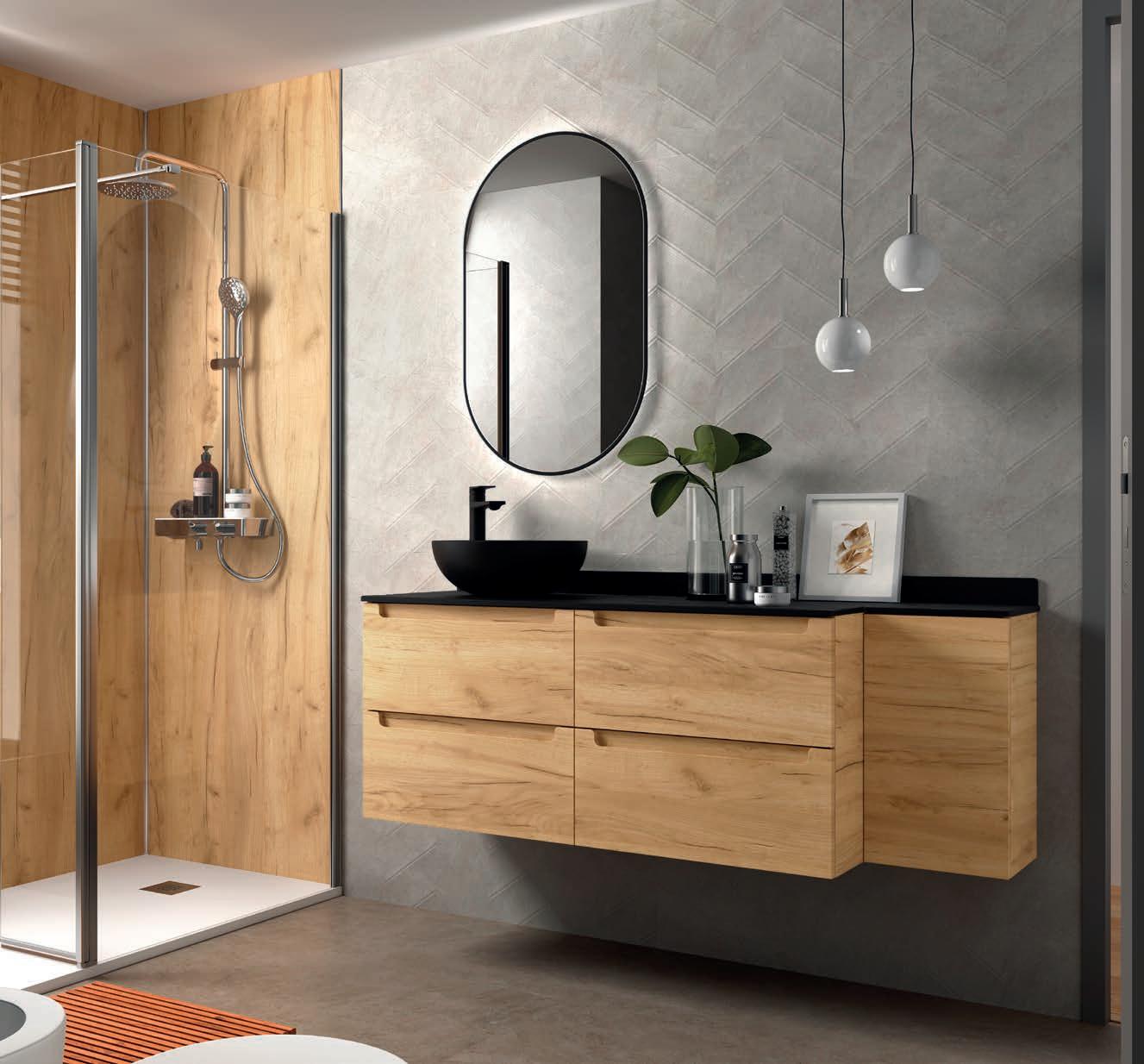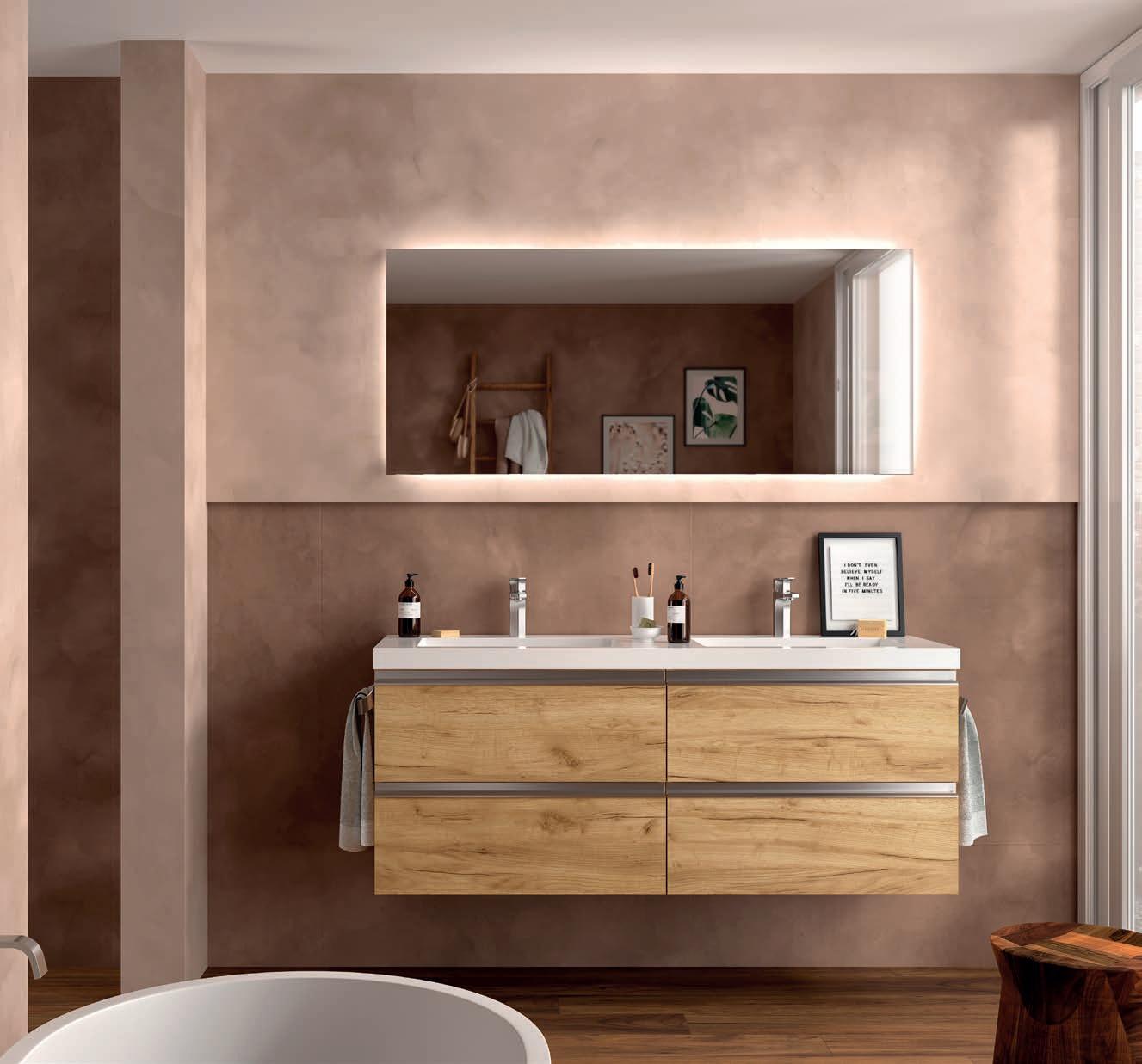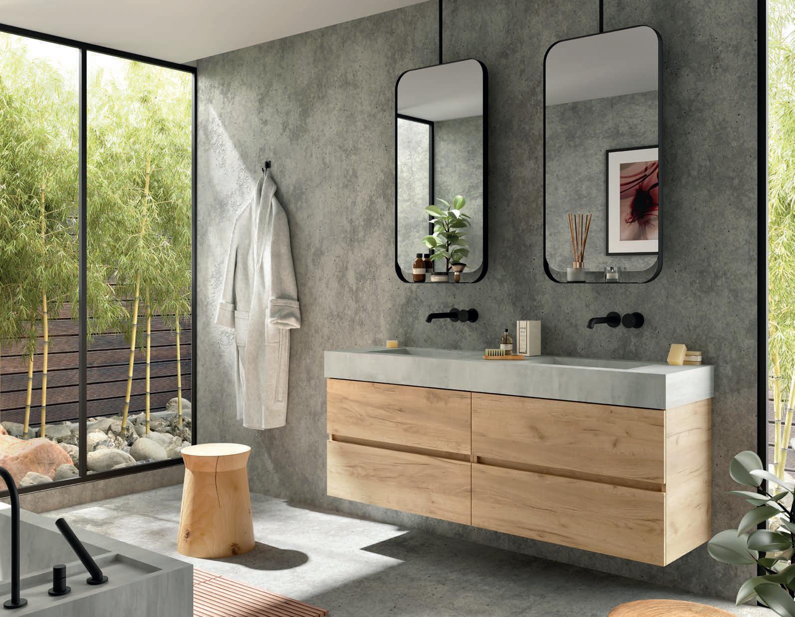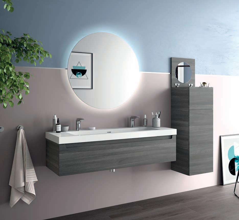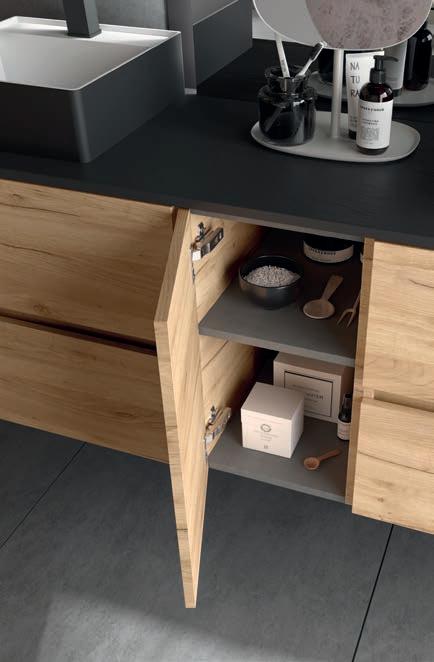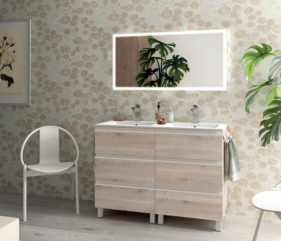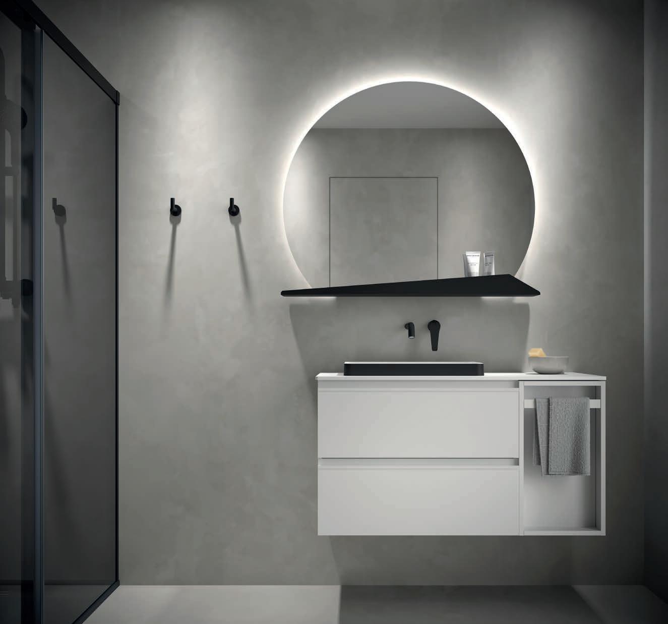 Resistant to cleaning products and disinfectants Bespoken Dirt repellent Lock brake Without handle Exterior handle integrated handle Reversible Runners Grass Runners Hettich Spacer included Under sink insert drawer Push system drawers Push system doors Multilayer laminated board Metal drawer Total extraction Extraction plus Wooden drawer MDF board Particle board Natural wood finish Matt lacquer finish Gloss lacquer finish Laminate board finish Boardwith 3D finish No need for drilling Hard-wearing adhesive fixing IP 44 Horizontal/ Vertical Mirror with fixing Low consumption Backlit mirror Work lighting Sensor on/off Sensor antifog Rotating mirror
