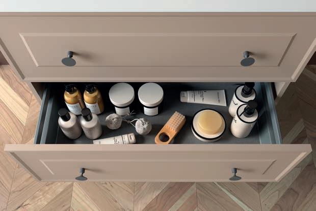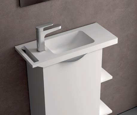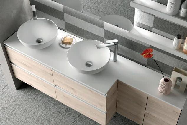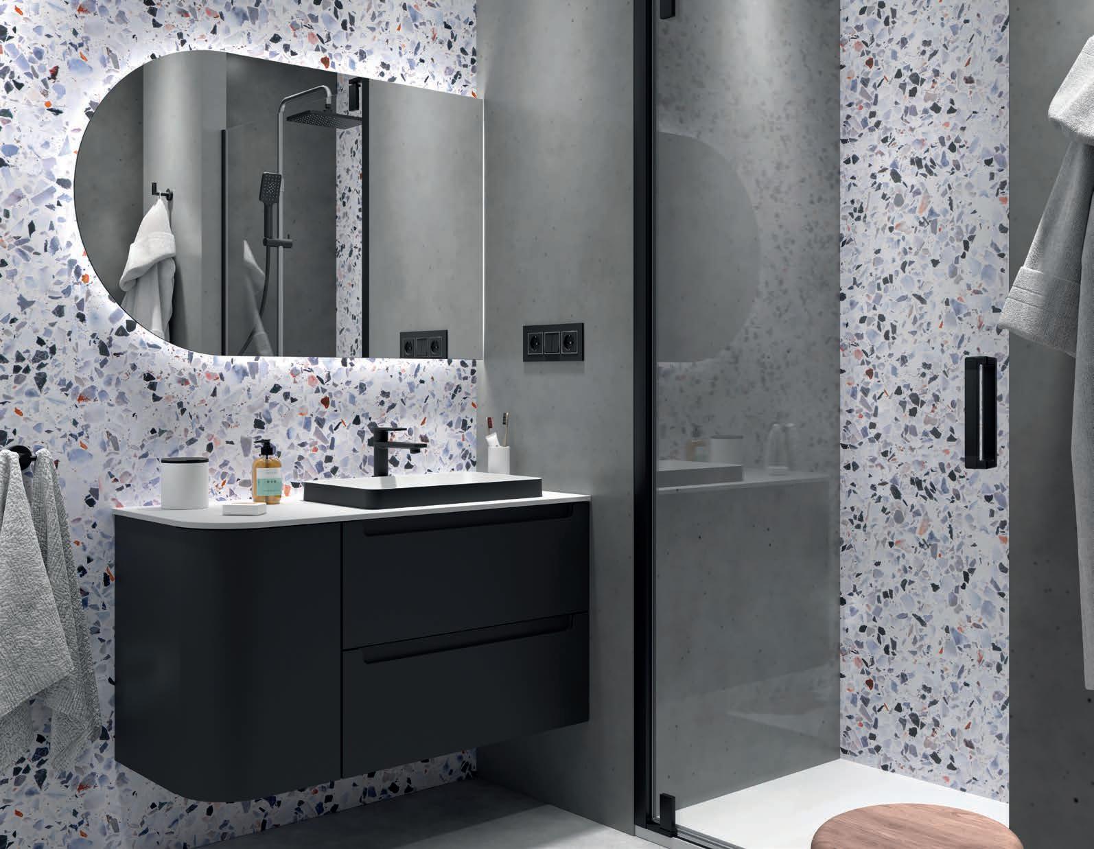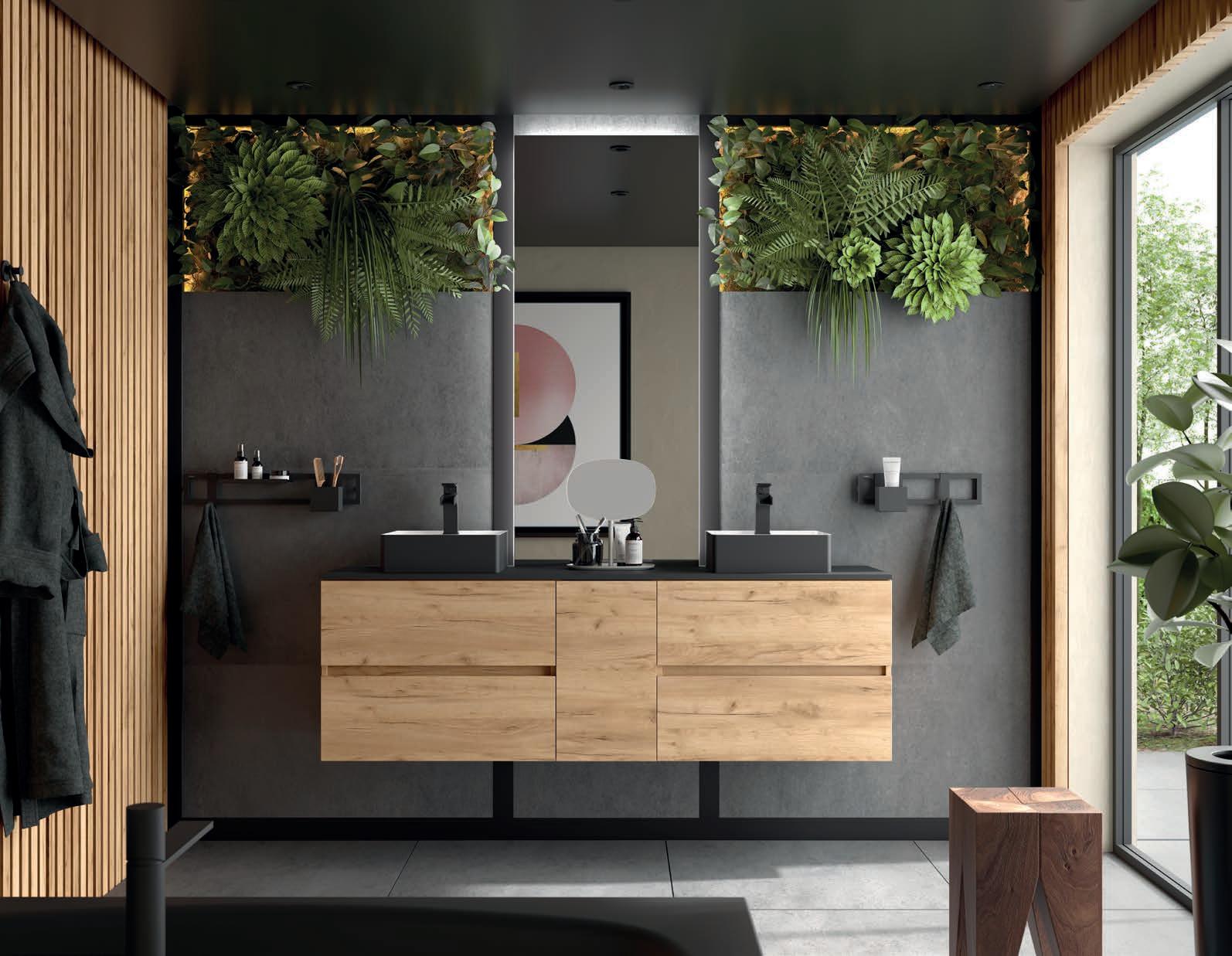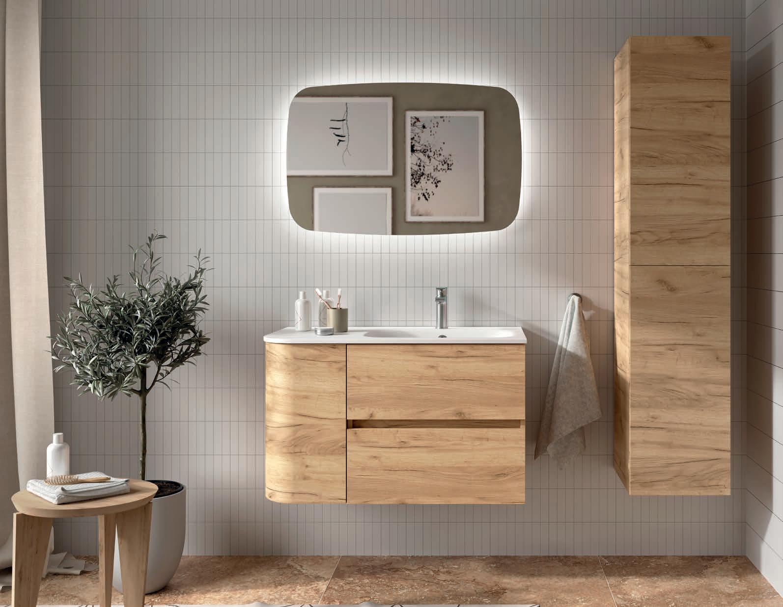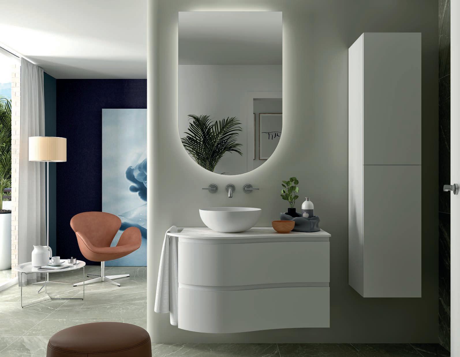 Resistant to cleaning products and disinfectants Bespoken Dirt repellent Lock brake Without handle Exterior handle integrated handle Reversible Runners Grass Runners Hettich Spacer included Under sink insert drawer Push system drawers Push system doors Multilayer laminated board Metal drawer Total extraction Extraction plus Wooden drawer MDF board Particle board Natural wood finish Matt lacquer finish Gloss lacquer finish Laminate board finish Boardwith 3D finish No need for drilling Hard-wearing adhesive fixing IP 44 Horizontal/ Vertical Mirror with fixing Low consumption Backlit mirror Work lighting Sensor on/off Sensor antifog Rotating mirror