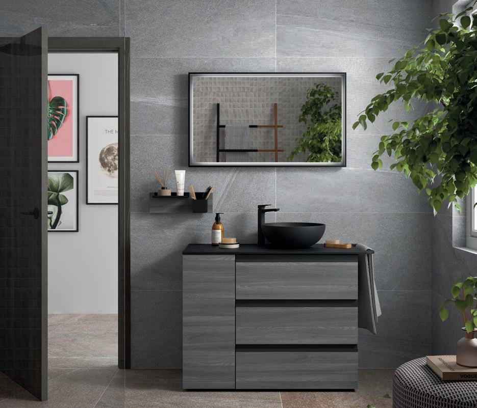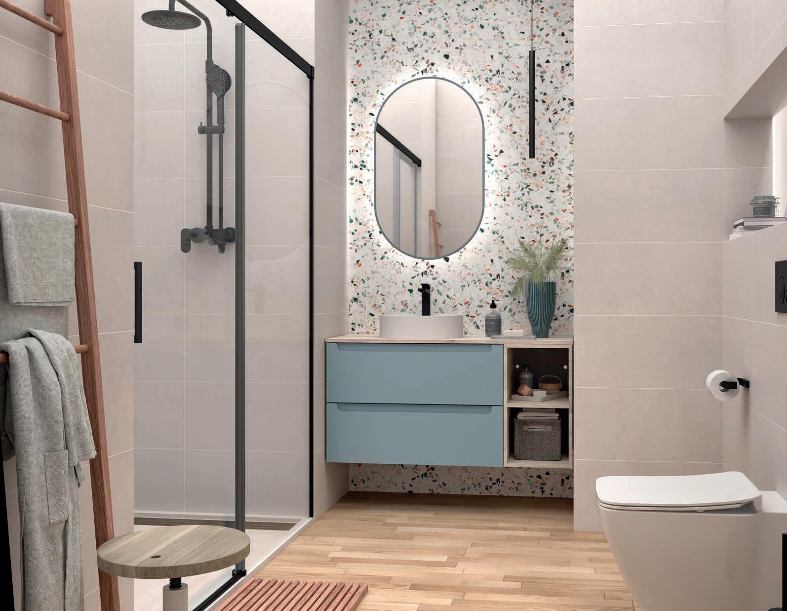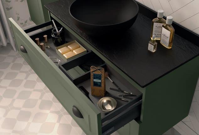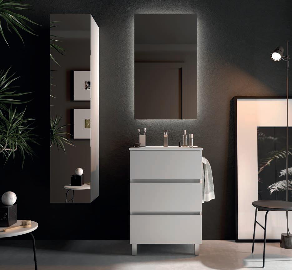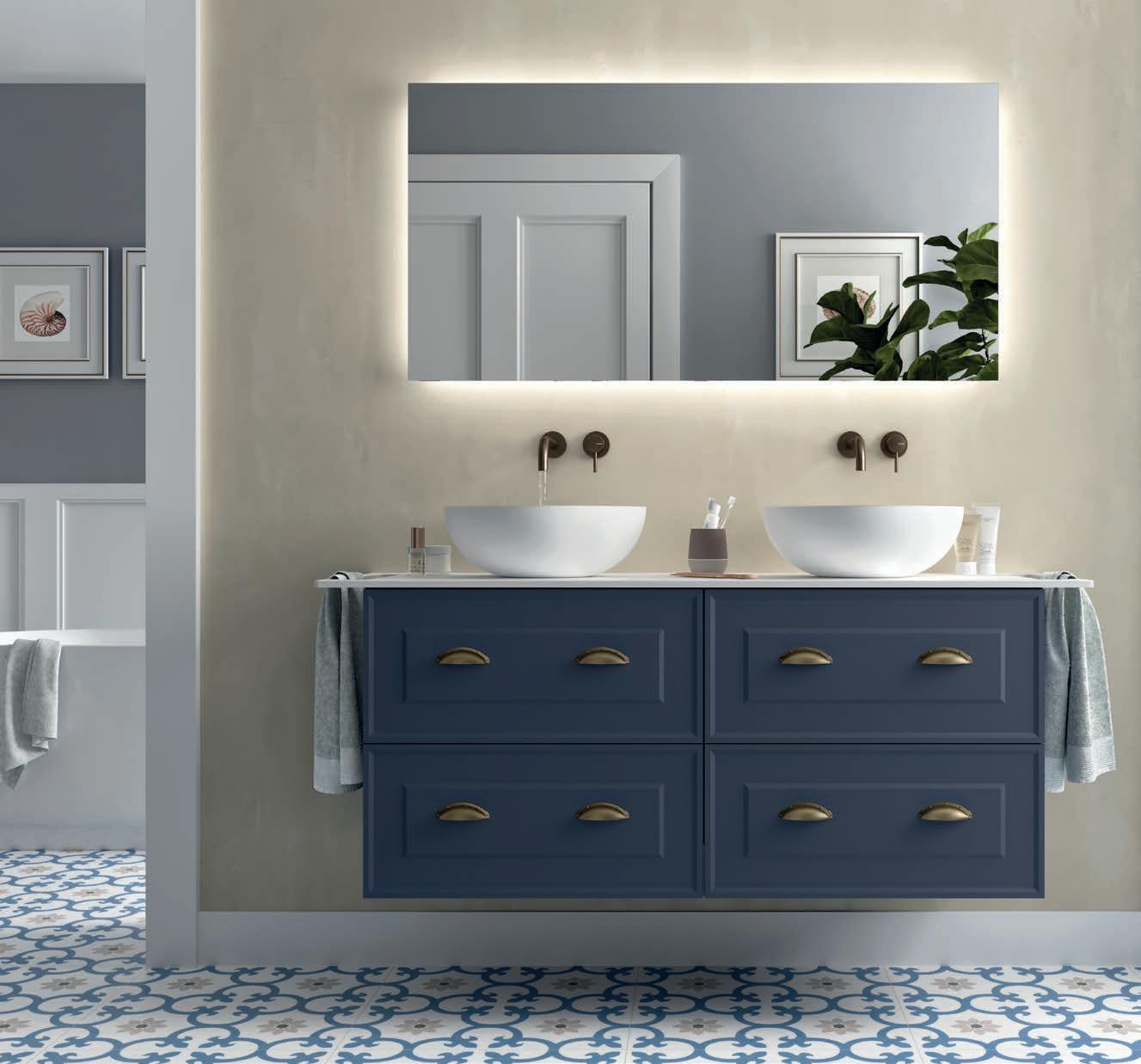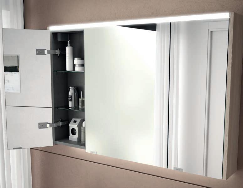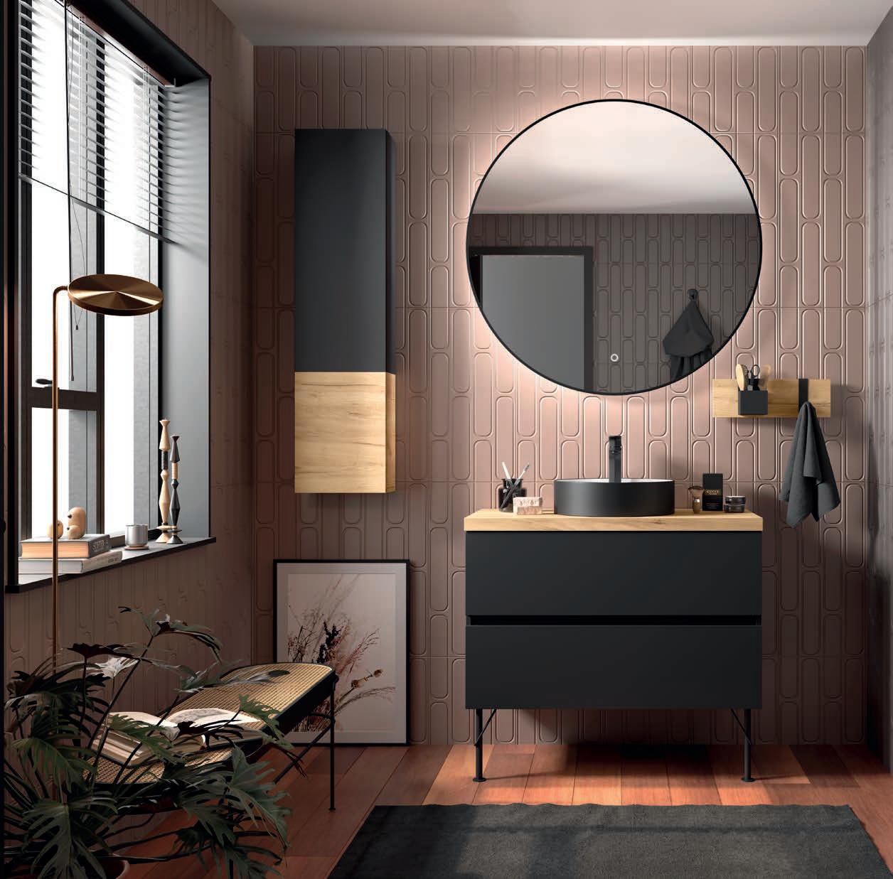 Resistant to cleaning products and disinfectants Bespoken Dirt repellent Lock brake Without handle Exterior handle integrated handle Reversible Runners Grass Runners Hettich Spacer included Under sink insert drawer Push system drawers Push system doors Multilayer laminated board Metal drawer Total extraction Extraction plus Wooden drawer MDF board Particle board Natural wood finish Matt lacquer finish Gloss lacquer finish Laminate board finish Boardwith 3D finish No need for drilling Hard-wearing adhesive fixing IP 44 Horizontal/ Vertical Mirror with fixing Low consumption Backlit mirror Work lighting Sensor on/off Sensor antifog Rotating mirror