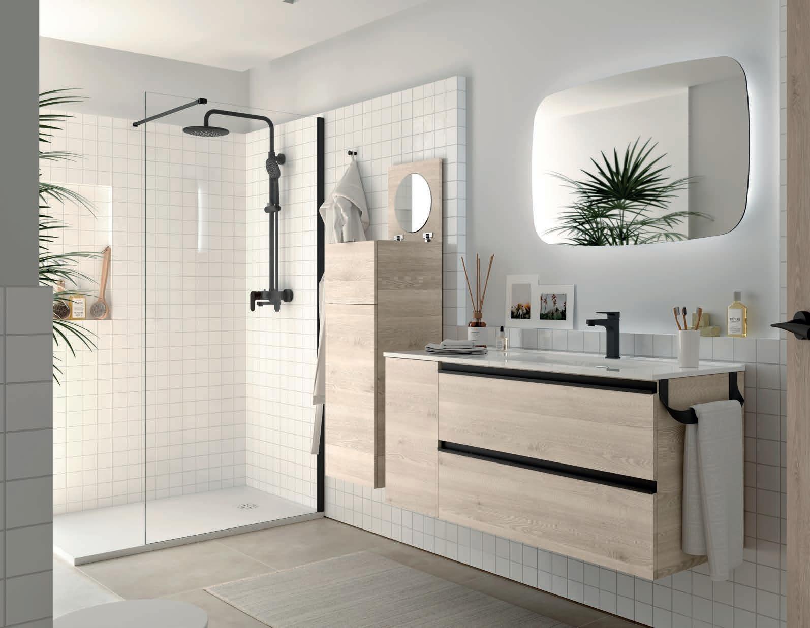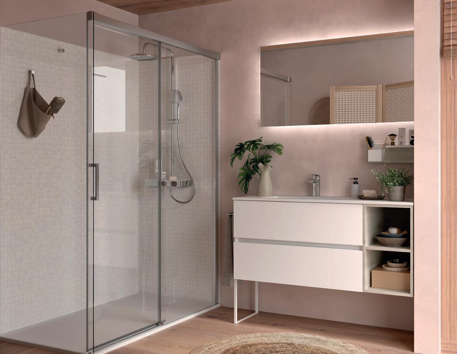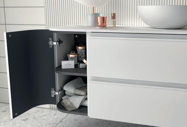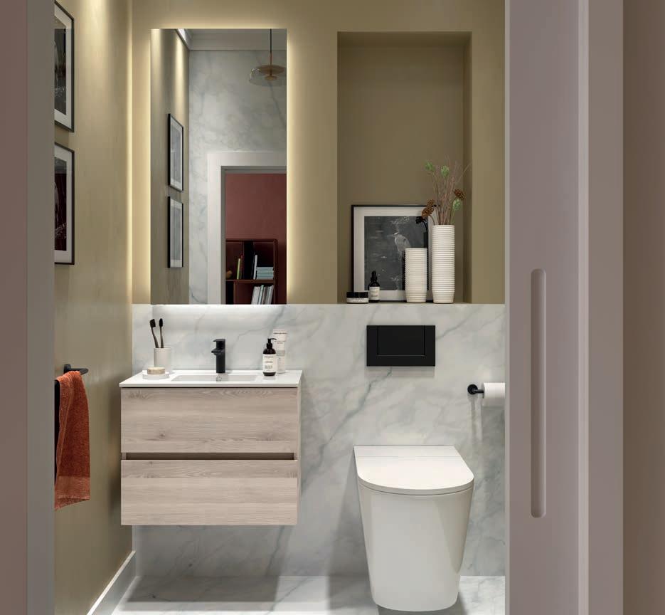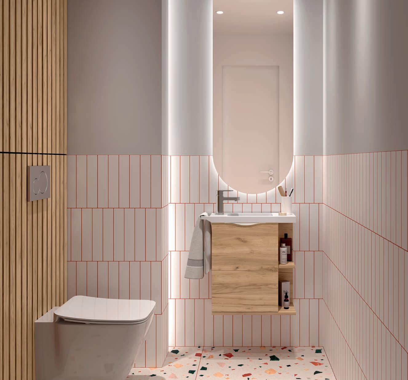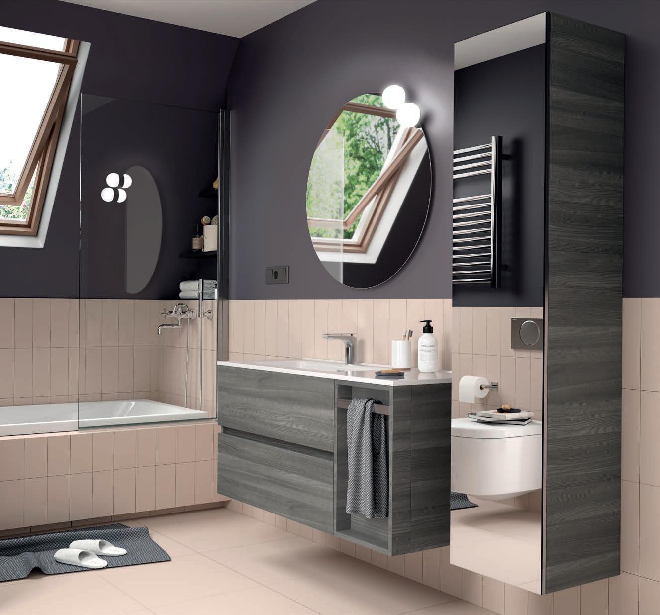 Resistant to cleaning products and disinfectants Bespoken Dirt repellent Lock brake Without handle Exterior handle integrated handle Reversible Runners Grass Runners Hettich Spacer included Under sink insert drawer Push system drawers Push system doors Multilayer laminated board Metal drawer Total extraction Extraction plus Wooden drawer MDF board Particle board Natural wood finish Matt lacquer finish Gloss lacquer finish Laminate board finish Boardwith 3D finish No need for drilling Hard-wearing adhesive fixing IP 44 Horizontal/ Vertical Mirror with fixing Low consumption Backlit mirror Work lighting Sensor on/off Sensor antifog Rotating mirror