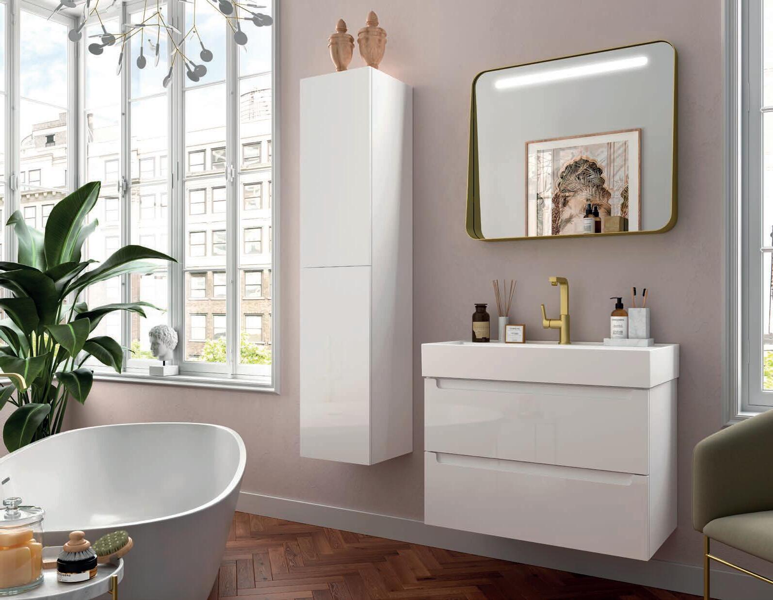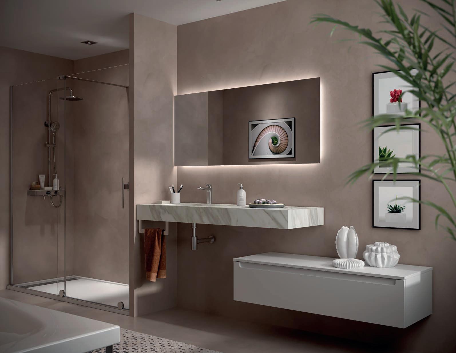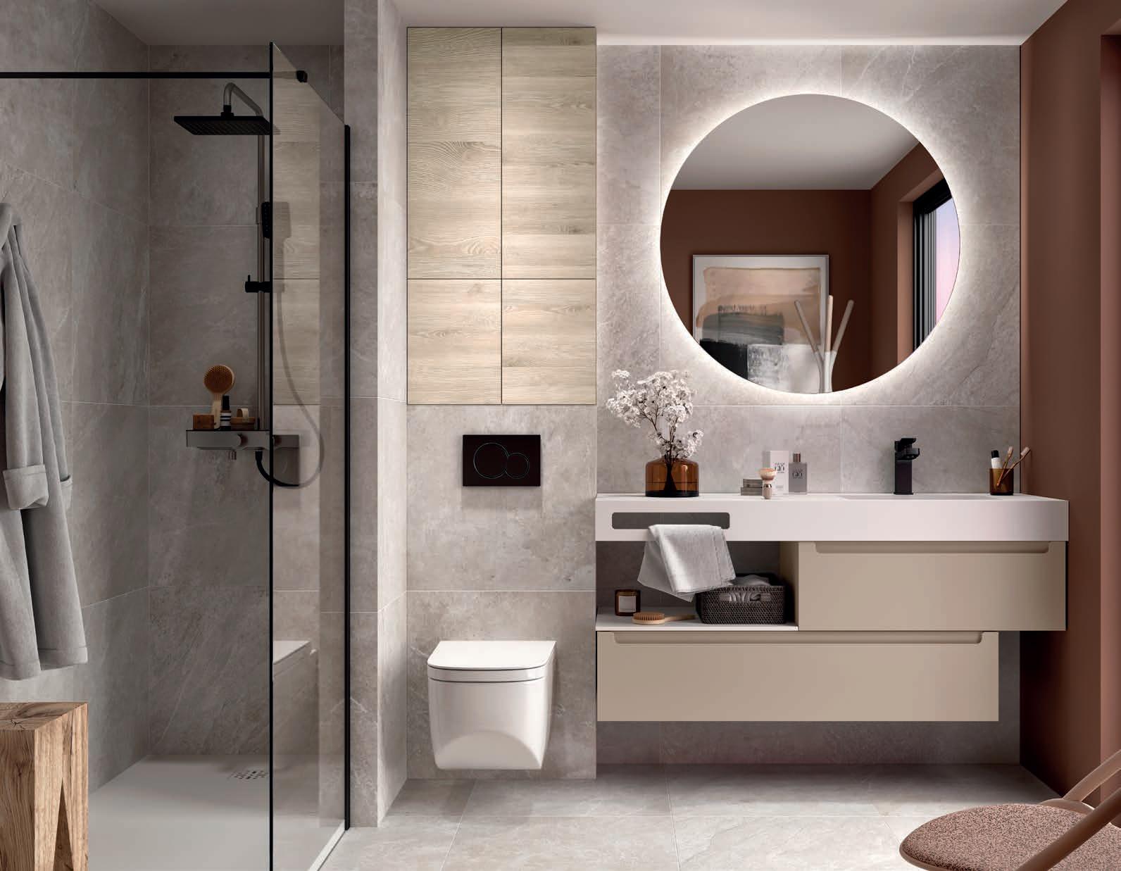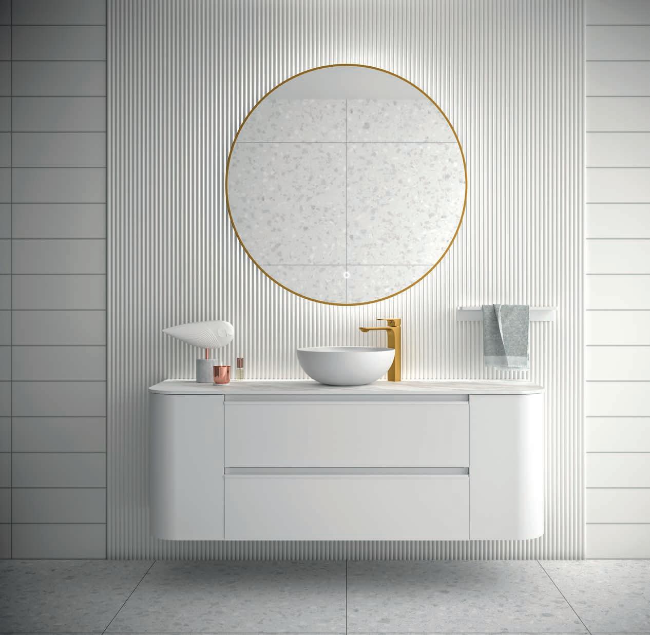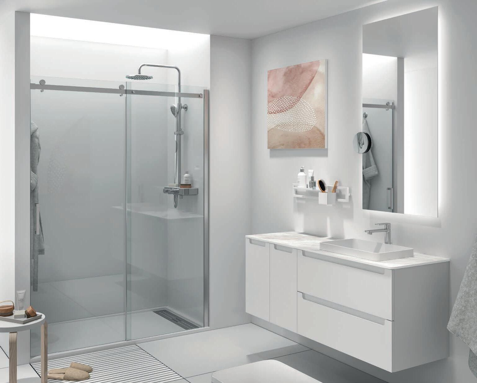 Resistant to cleaning products and disinfectants Bespoken Dirt repellent Lock brake Without handle Exterior handle integrated handle Reversible Runners Grass Runners Hettich Spacer included Under sink insert drawer Push system drawers Push system doors Multilayer laminated board Metal drawer Total extraction Extraction plus Wooden drawer MDF board Particle board Natural wood finish Matt lacquer finish Gloss lacquer finish Laminate board finish Boardwith 3D finish No need for drilling Hard-wearing adhesive fixing IP 44 Horizontal/ Vertical Mirror with fixing Low consumption Backlit mirror Work lighting Sensor on/off Sensor antifog Rotating mirror