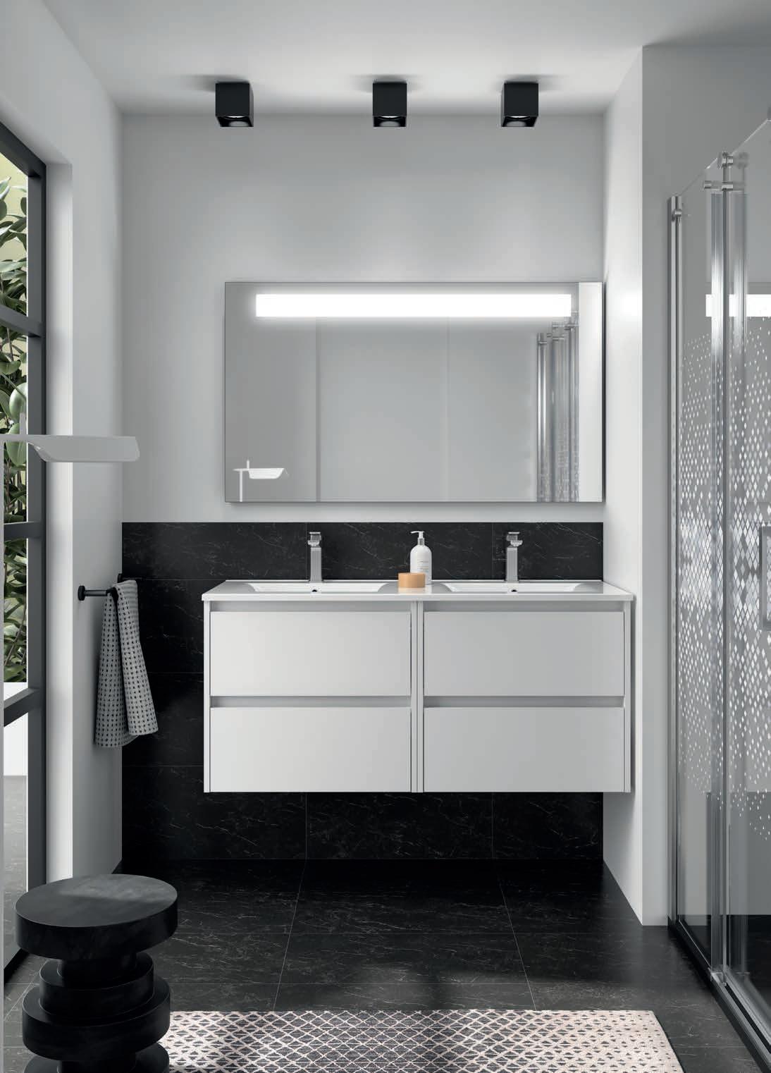 Look Noja 1000 Cod. 105507 - Set con top 1000 White gloss - 349€ Cod. 21854 - Lavabo Seduction - 198€ Cod. 106049 - Specchio Set Optimus 1000 - 228€ 2x Cod. 104360 - Colonna Noja White gloss - 239€/ud.