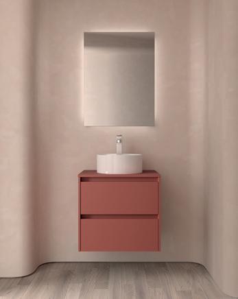 Composto por móvel Noja de 2 portas e tampo em acabamento de móvel. Lavatório de pousar não incluído.