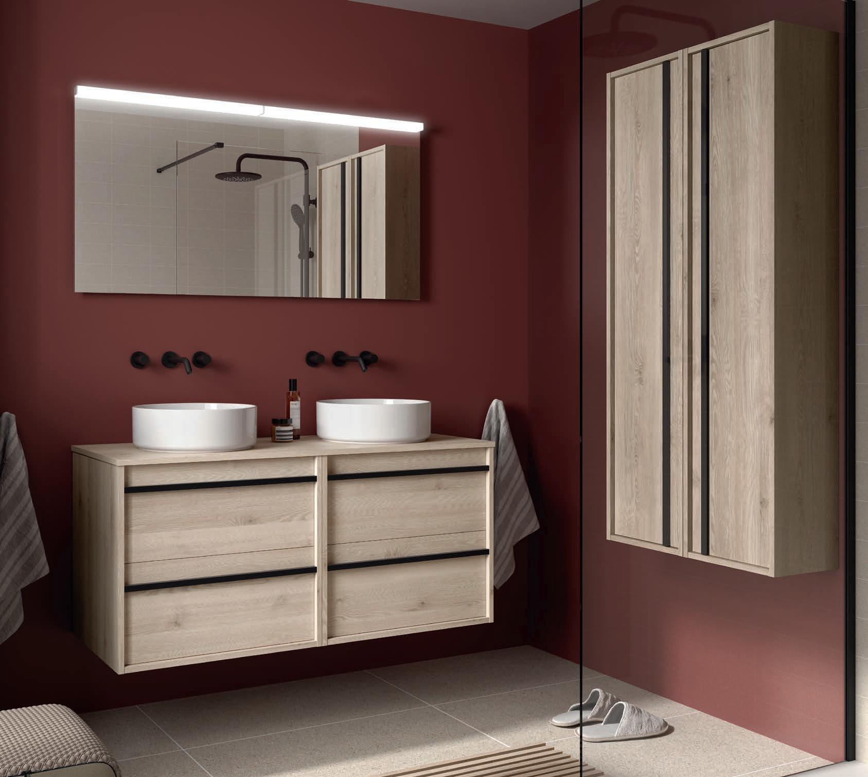 Veja Noja 1200 Cod. 105521 - Conjunto móvel + tampo duplo 1200 Red satin - 494€ 2x Cod. 87734 - Lavatório Lokum 226€/ ud. 2x Cod. 105597 - Espelho Nora 600 205 €/ud.
