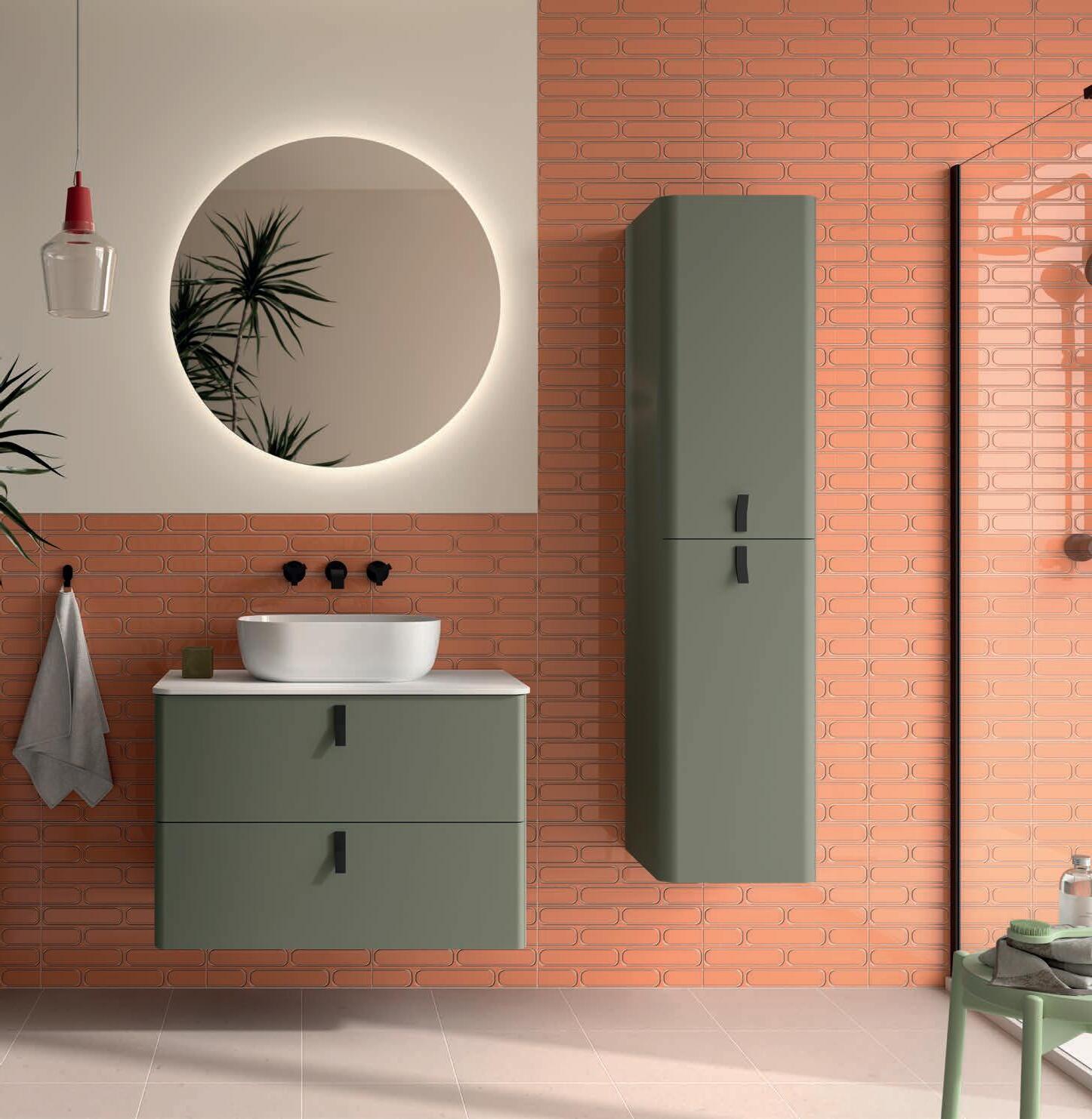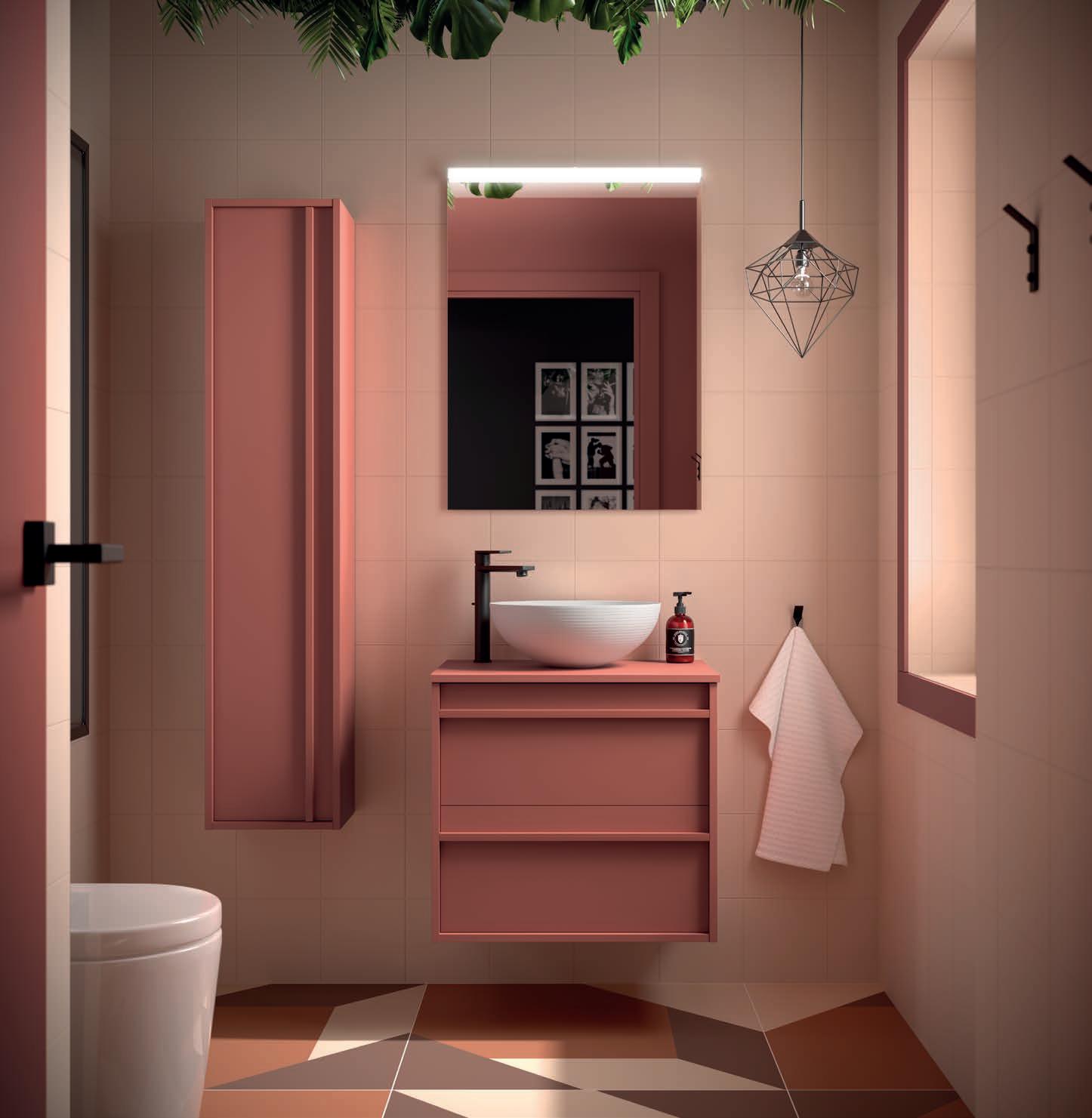 Cor e personalidade com conjuntos de mobiliário e bancada do mesmo acabamento é um recurso para uma casa de banho que respira vitalidade.