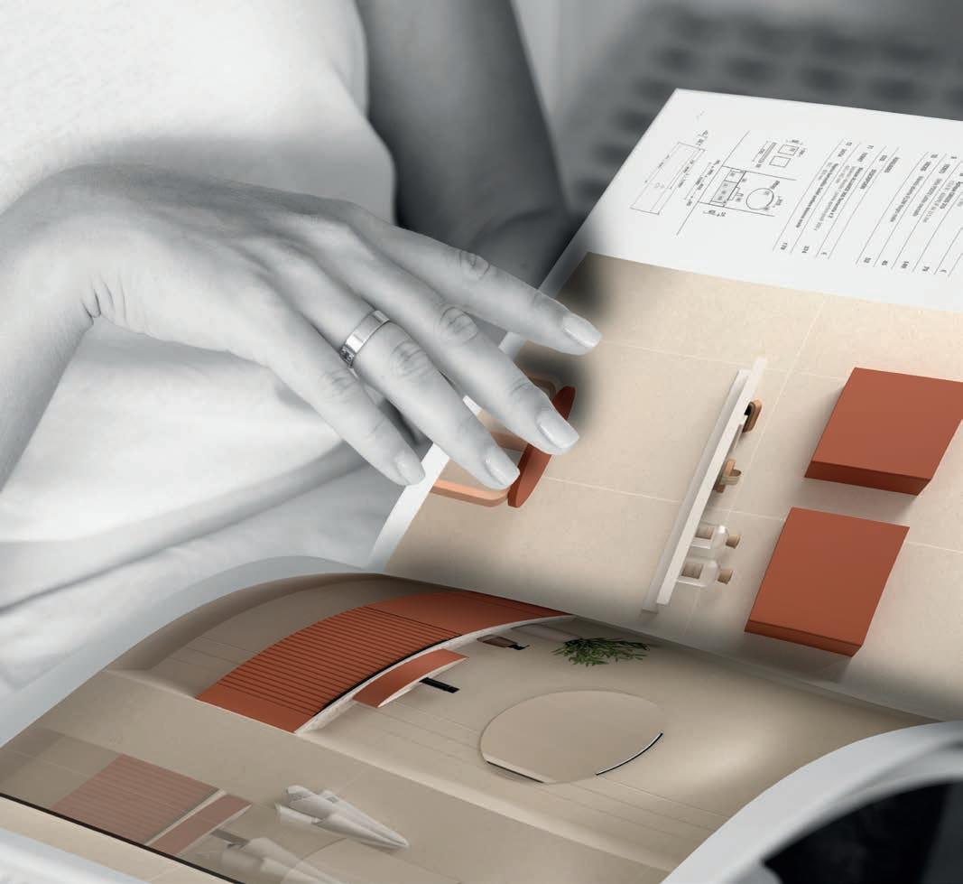 As cores dos acabamentos dos diferentes materiais: madeira, vidro, mármore e perfis de divisórias que figuram no catálogo são sempre aproximadas visto que estão sujeitas ao processo de impressão e variação de cor pela iluminação fotográfica. W
