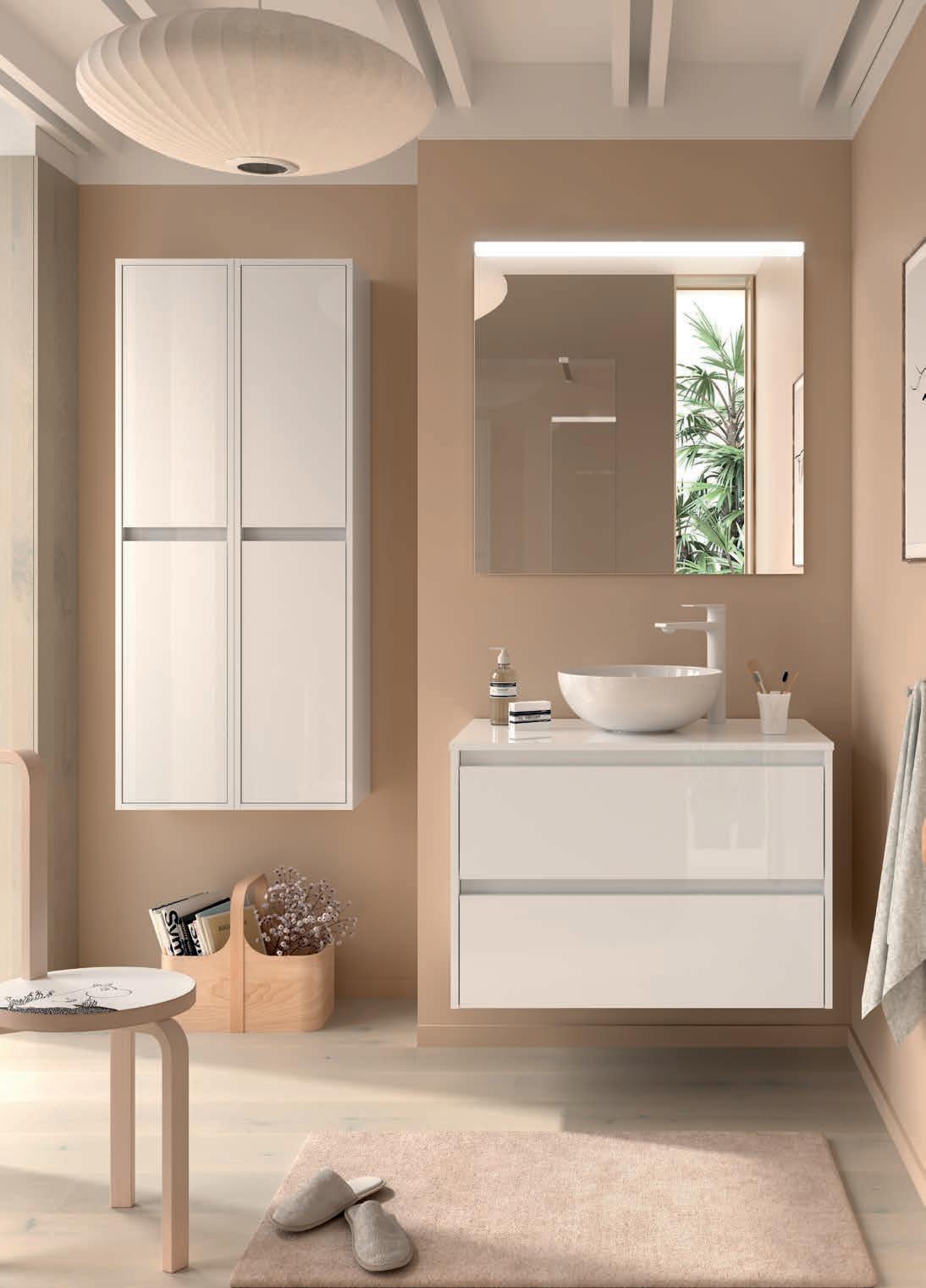 Veja Noja 1000 Cod. 105507 - Conjunto móvel + tampo 1000 White gloss - 347€ Cod. 21854 - Lavatório Seduction - 189€ Cod. 106049 - Espelho Conjunto Optimus 1000 - 224€ 2x Cod. 104360 - Pilar Noja White gloss - 218€/ud.