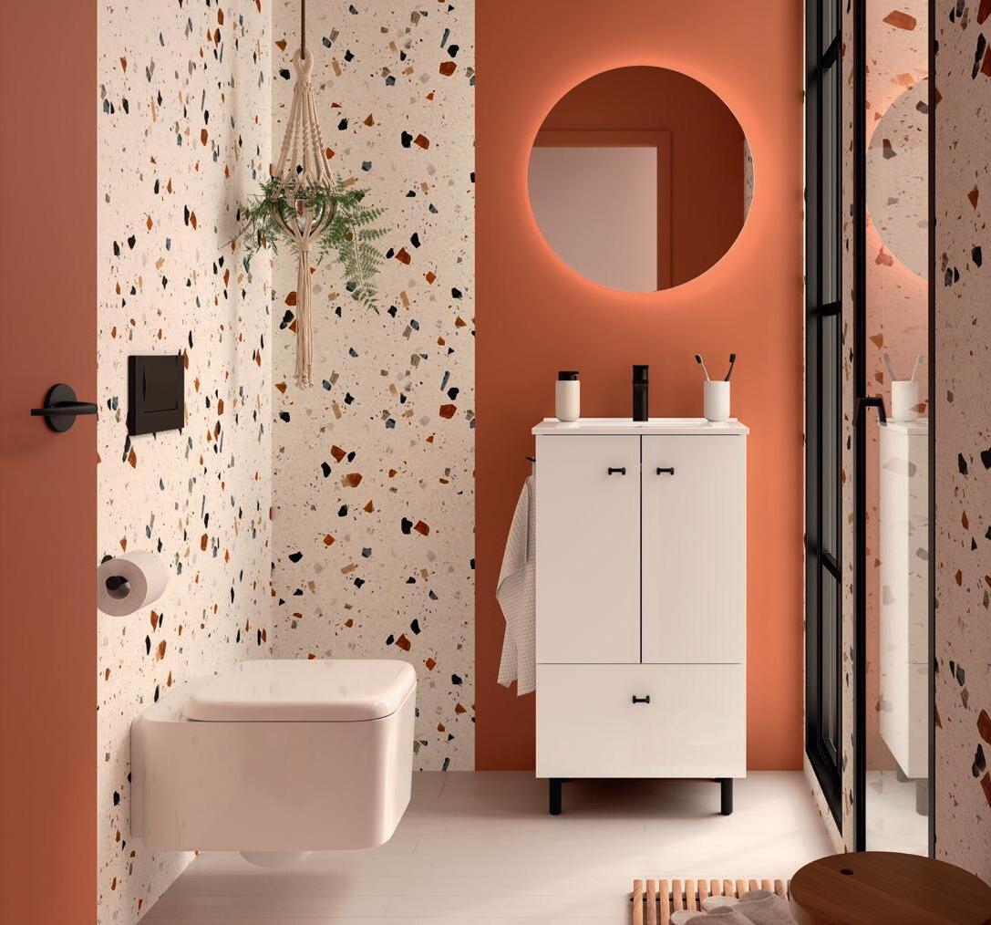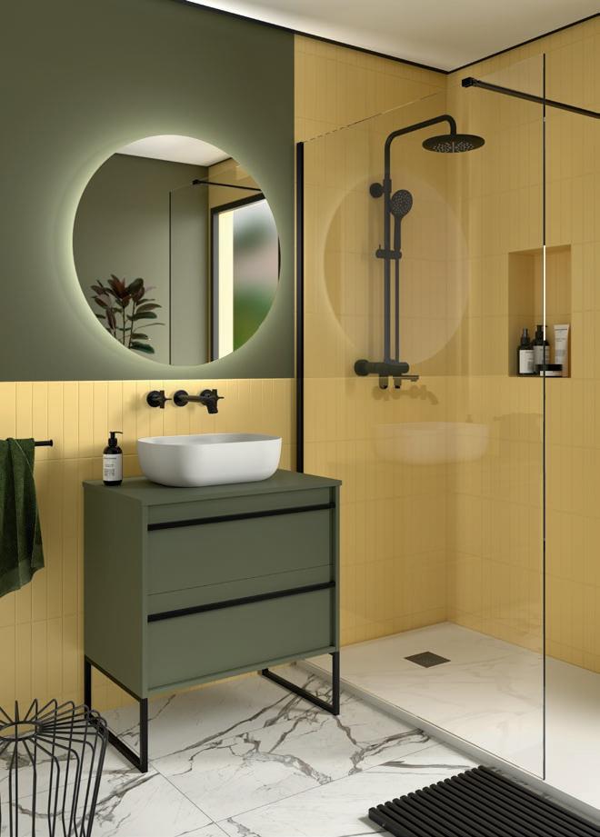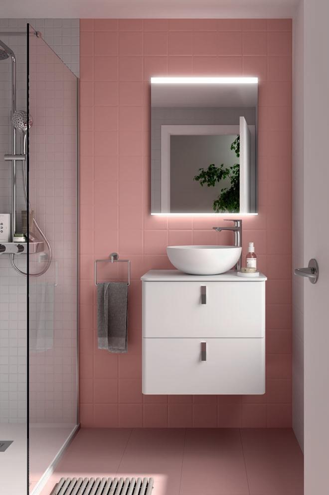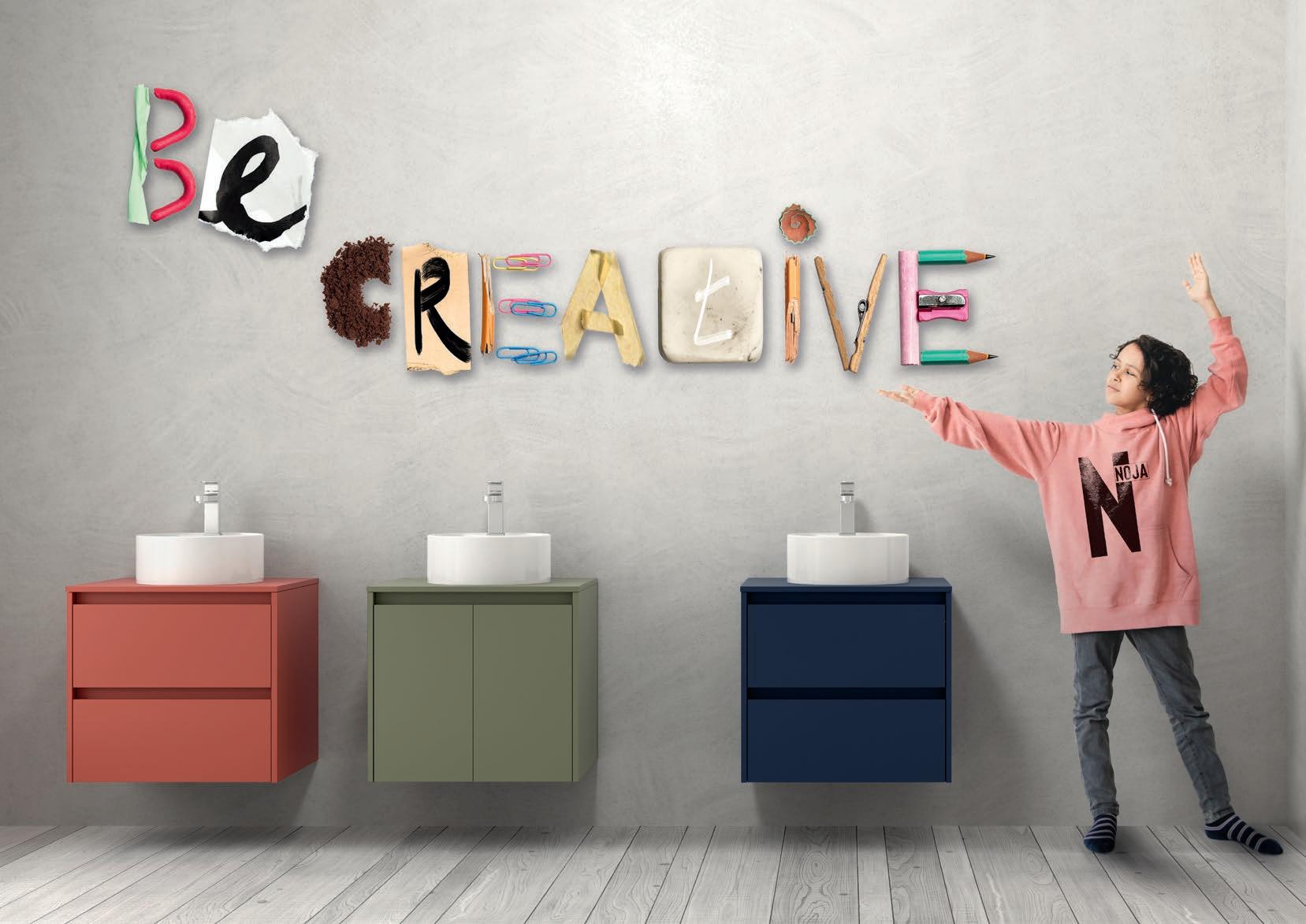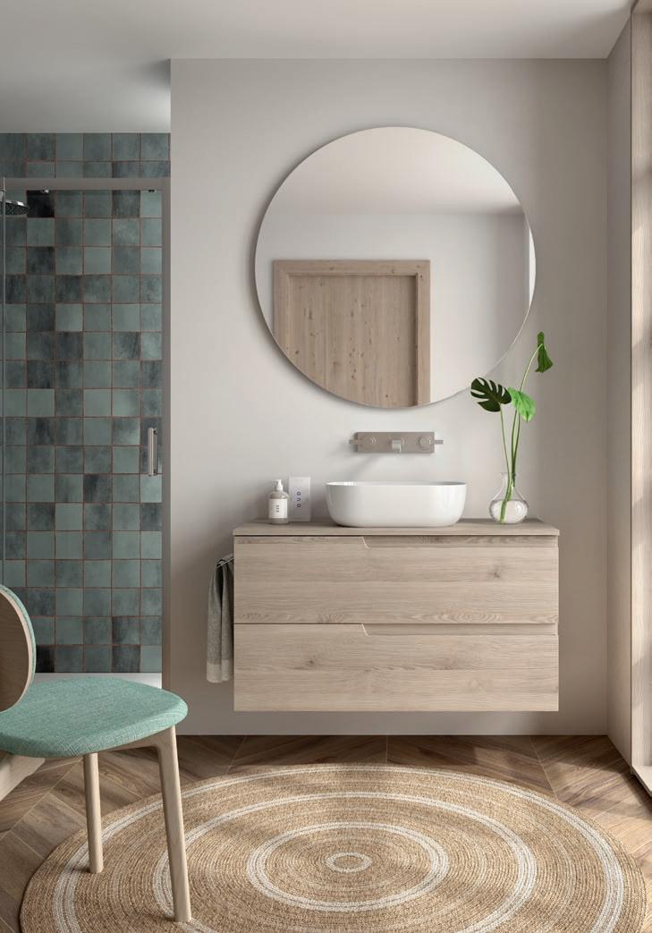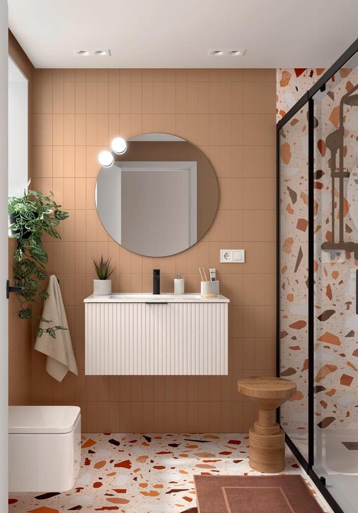 Color y personalidad con los conjuntos de mueble y encimera del mismo acabado. Un recurso para un baño que respira vitalidad