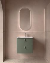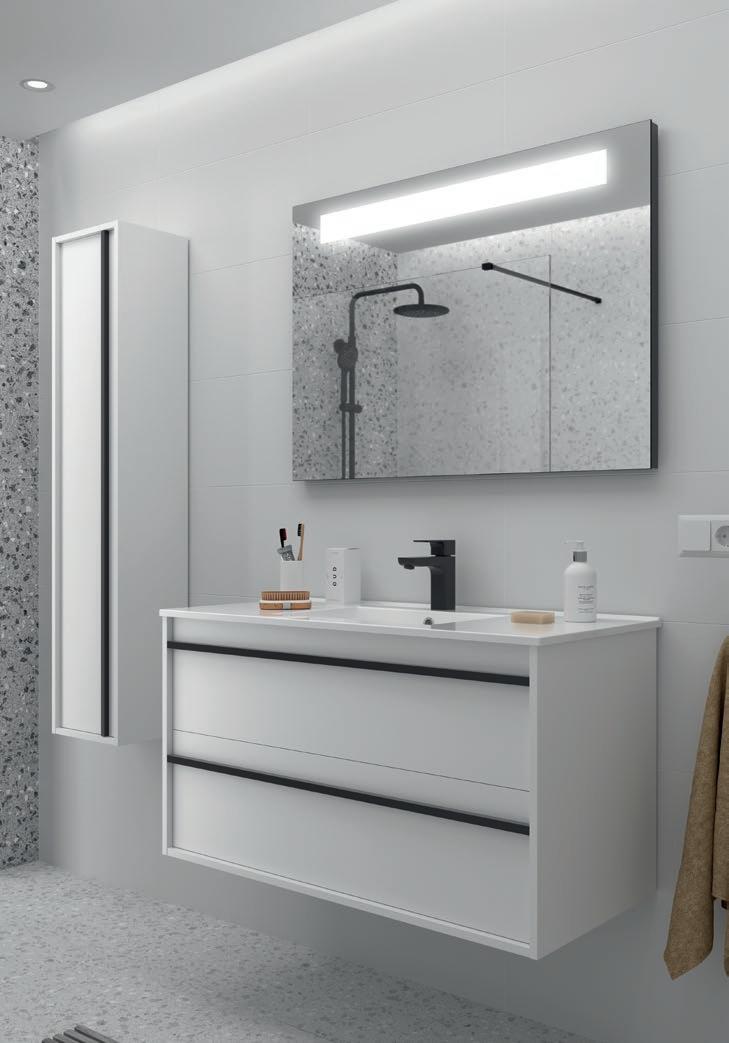 Compuesto de mueble, lavabo de porcelana y espejo. Incluido organizador de cajón y tiradores. Acabado de tirador negro, excepto en acabados con ( * ) tirador en acabado del mueble. Los conjuntos de 1400 llevan lavabo de carga mineral.