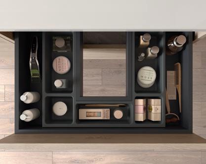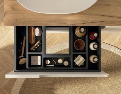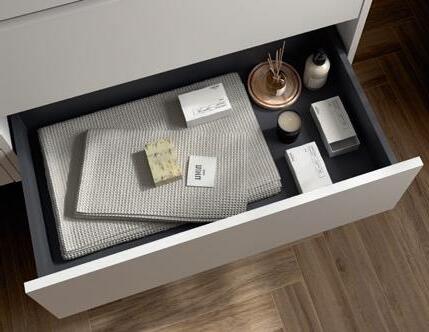 Compuesto de mueble y lavabo de porcelana. Incluido organizador de cajón y tiradores. Acabado de tirador negro, excepto en acabados con ( * ) tirador en acabado del mueble. Los conjuntos de 1400 llevan lavabo de carga mineral.