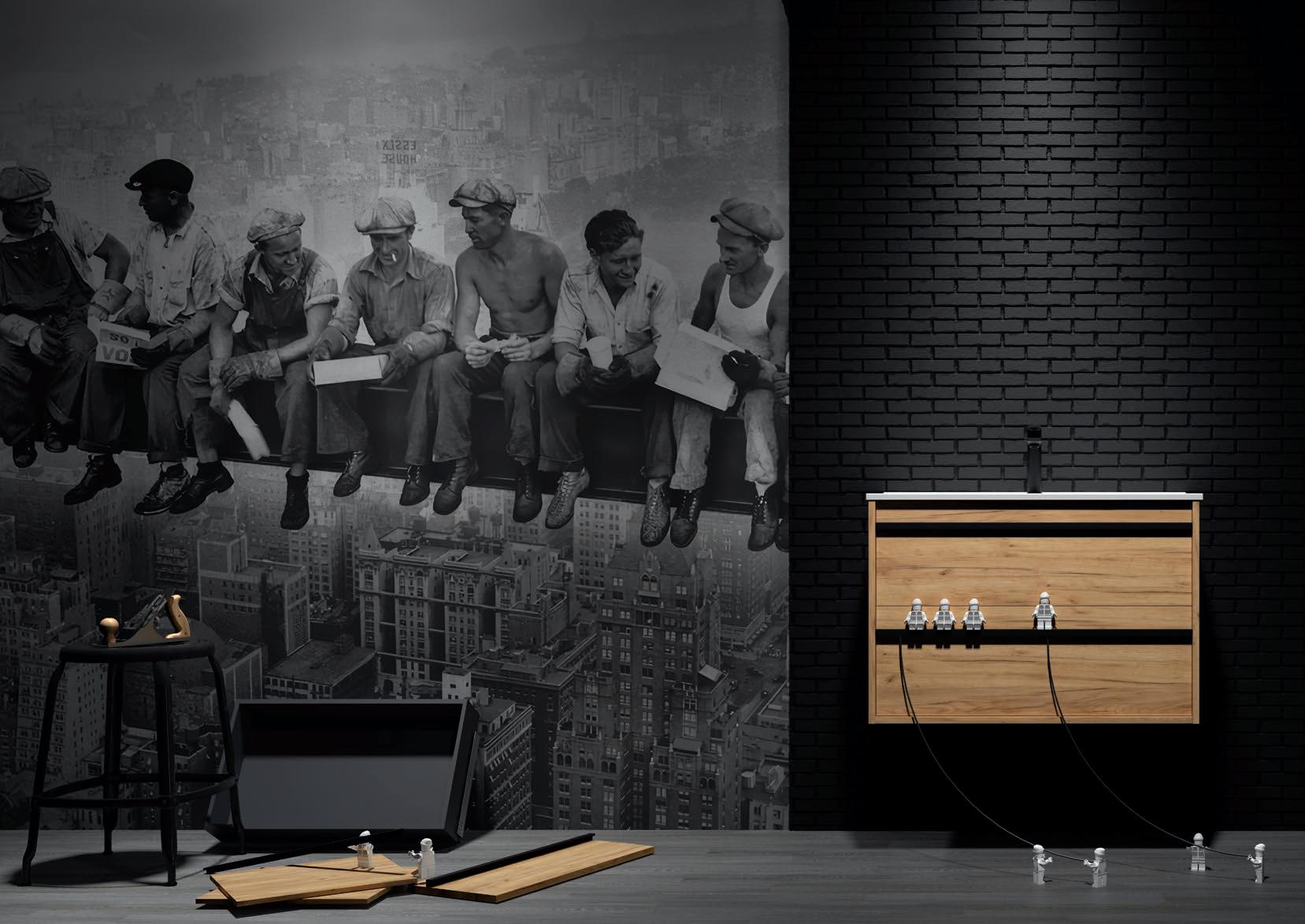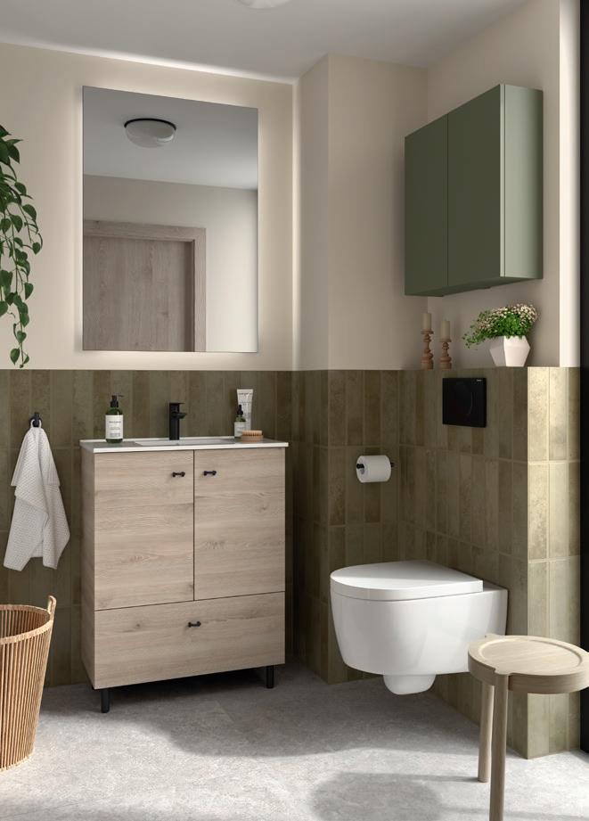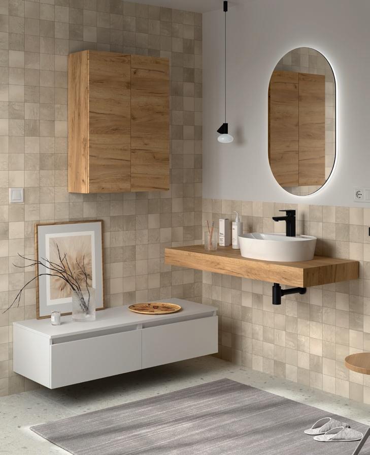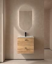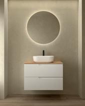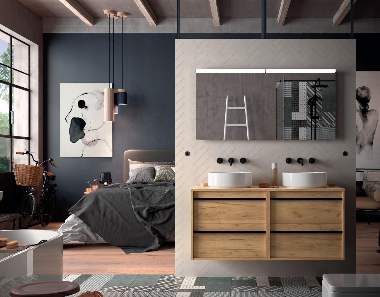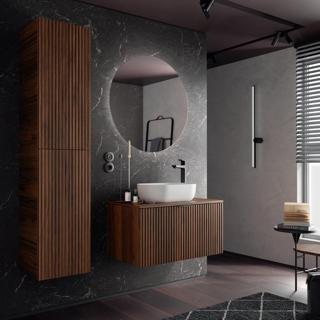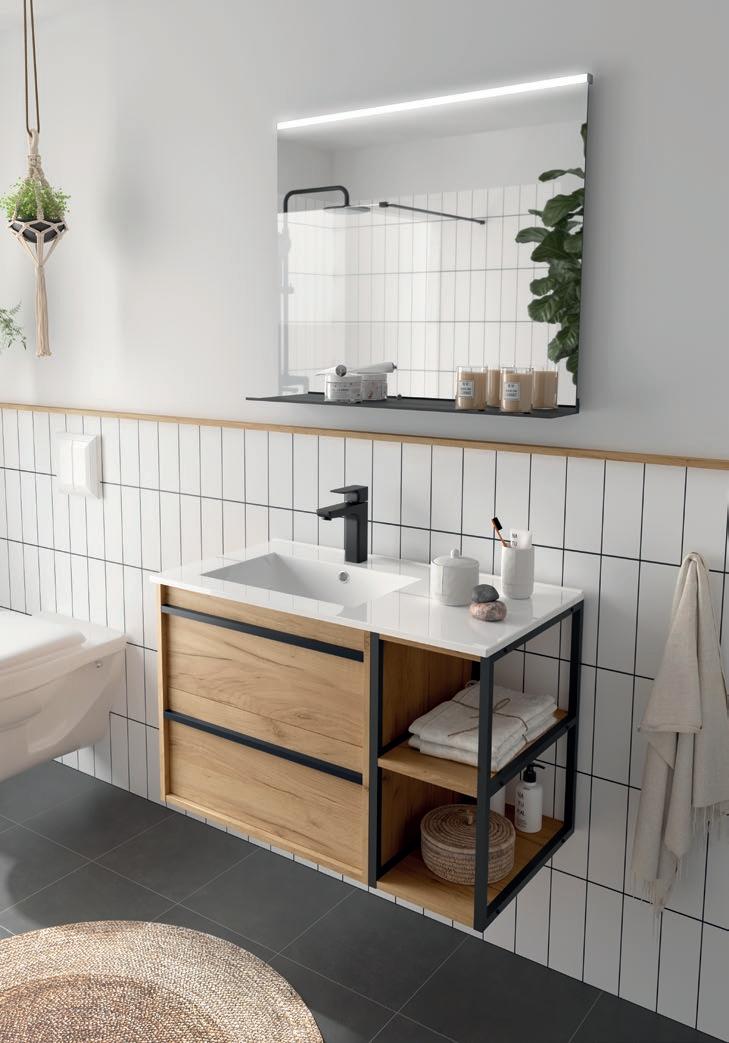 Look Noja 800 Cod. 105478 - Conjunto encimera NOJA 800 Roble áfrica - 285€ | Cod. 87734 - Lavabo de posar LOKUM Negro mate - 199€ | Cod. 105600 - Espejo
