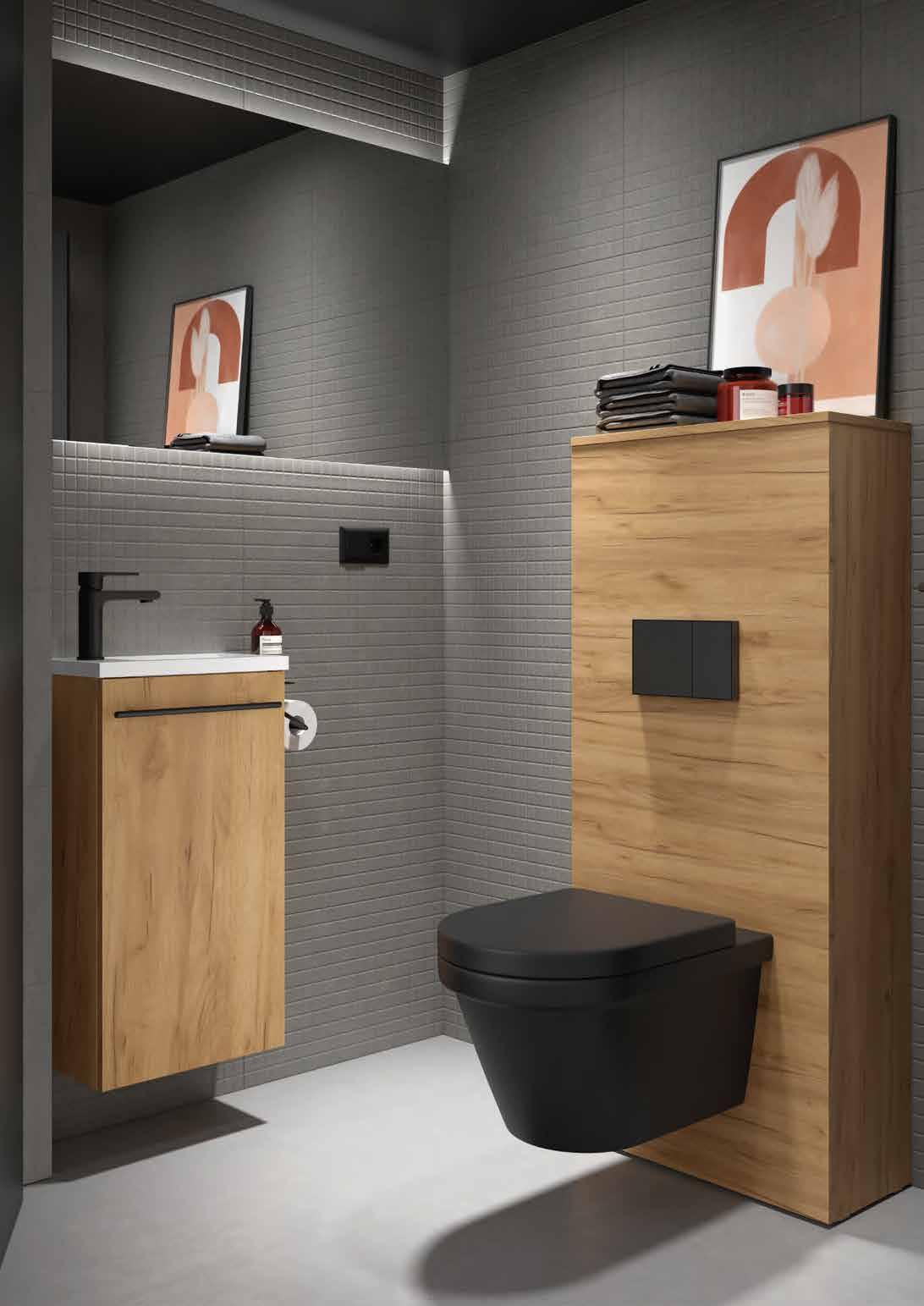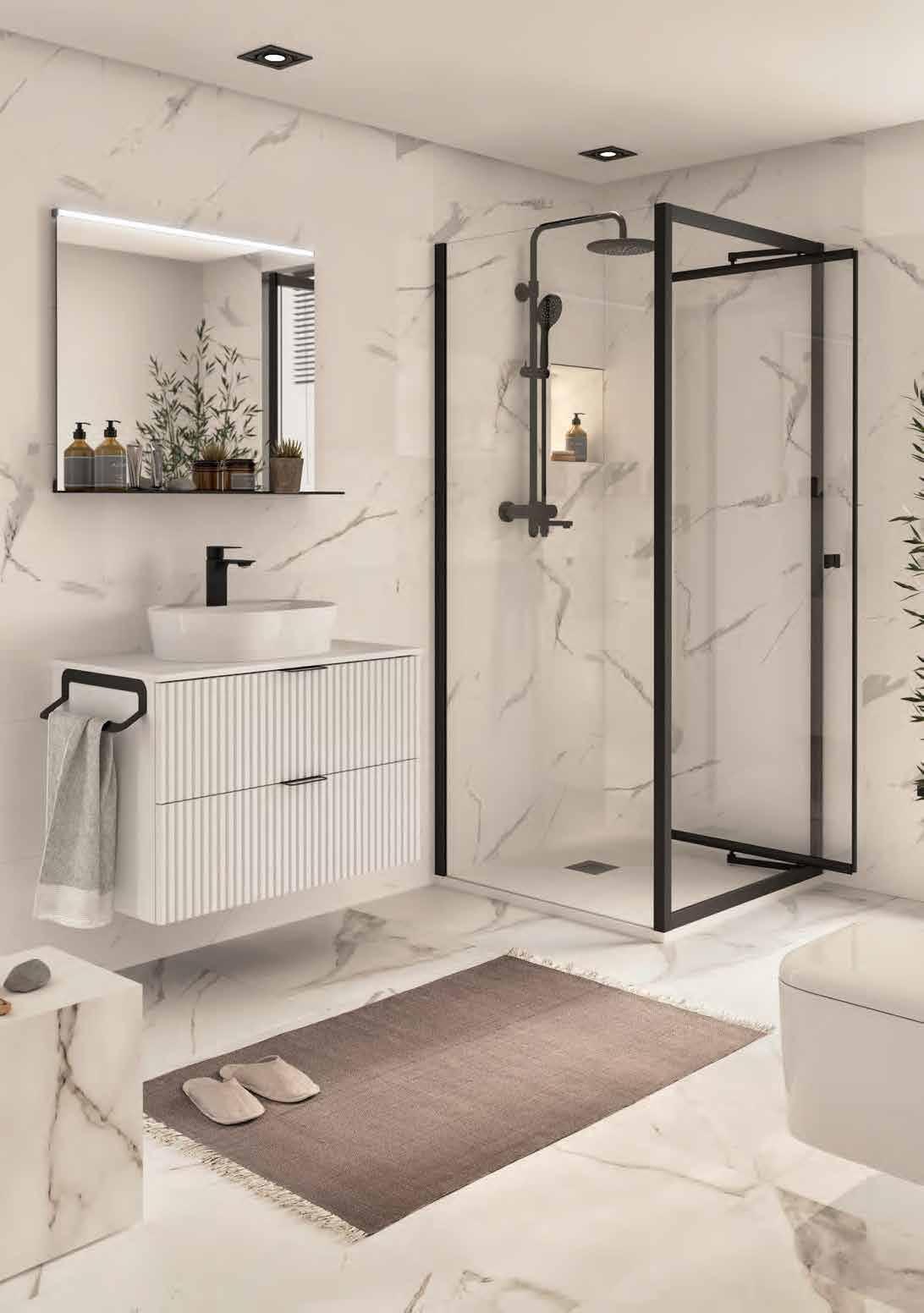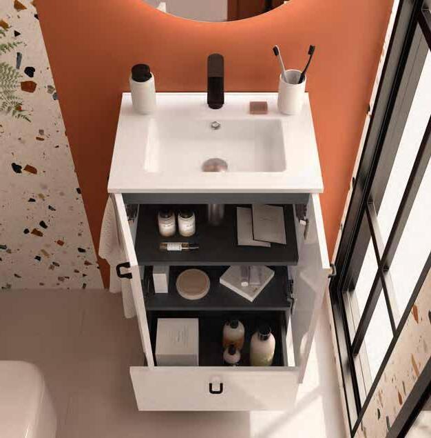 Marville transforms small bathrooms into stylish spaces. Its design makes the most of the height with auxiliary units that expand storage without taking up additional floor space.