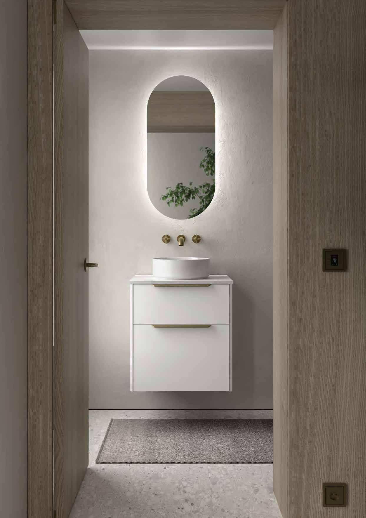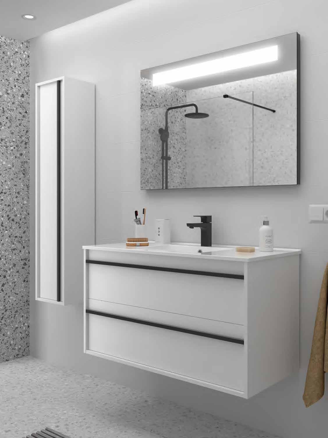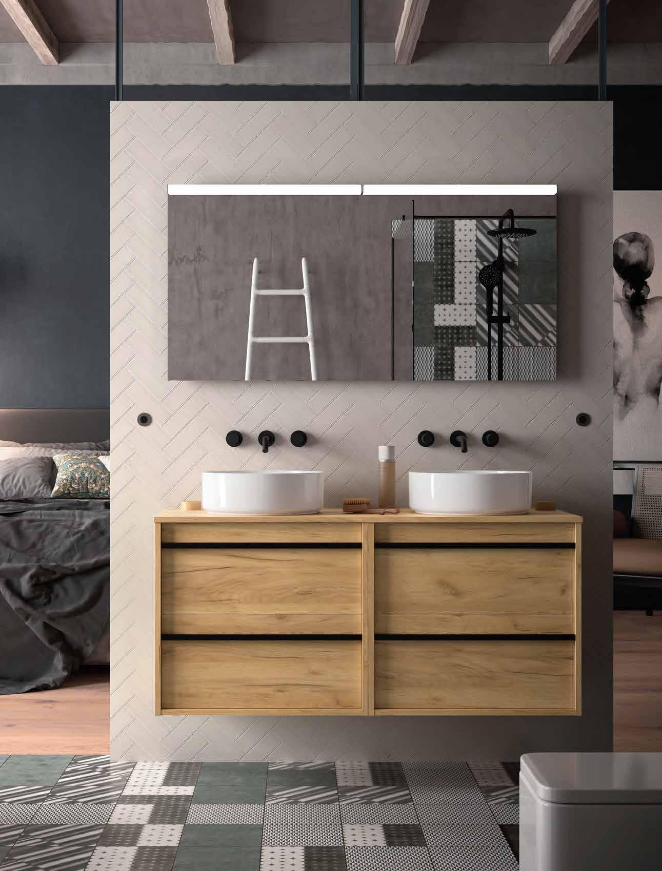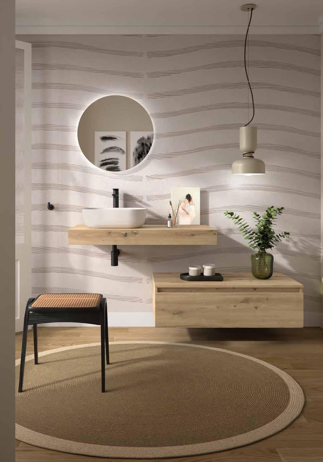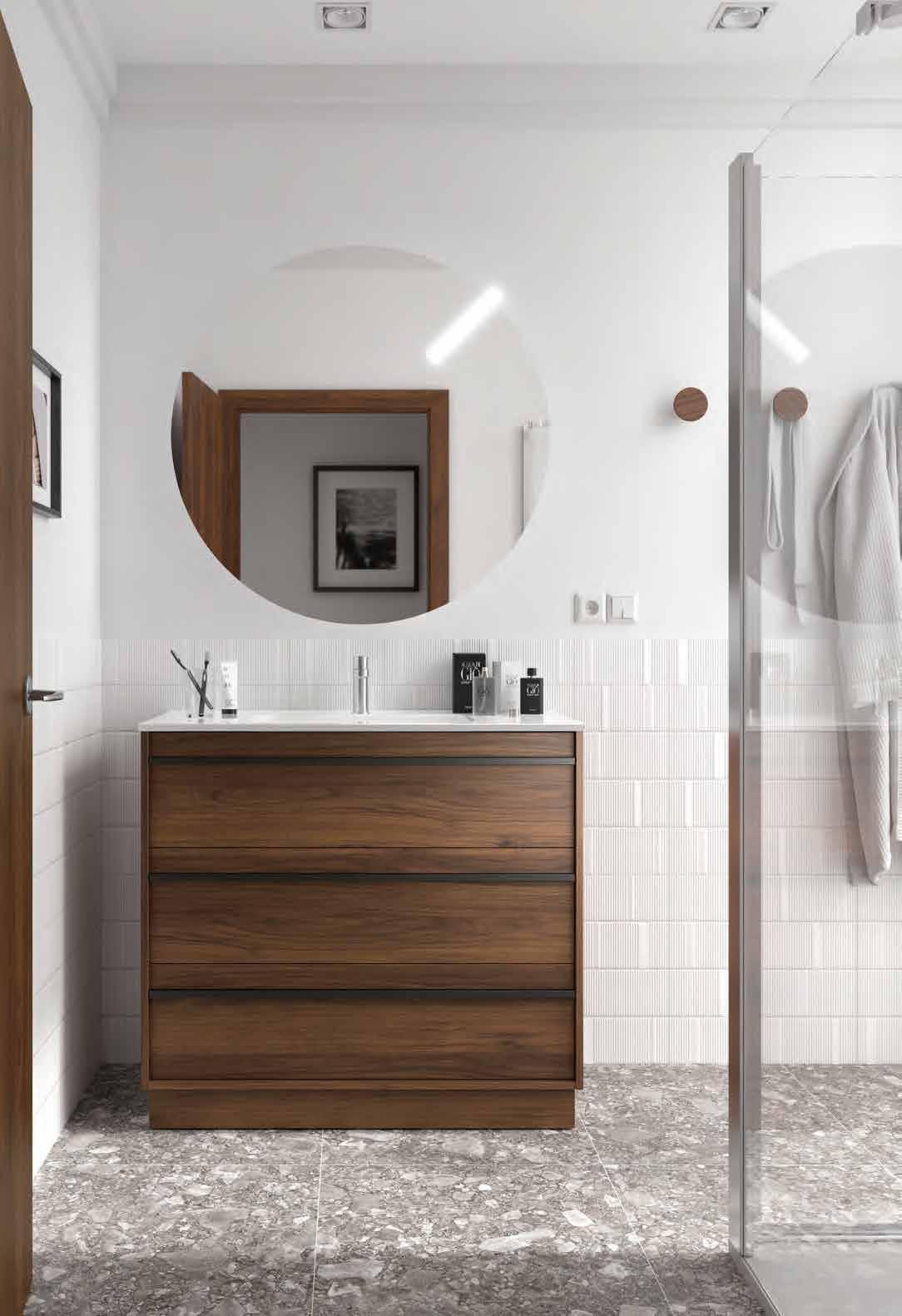 With NOJA, everything fits with you: furniture from 600 to 1000 mm, wall-mounted or floor-standing, in seven colors and three types of wood, with sinks and mirrors that multiply the options. Functional, versatile, and full of style, so every detail of your bathroom revolves around you.
