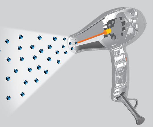 Die exklusive UV-Lampe aktiviert die Luft und wandelt sie in Aktiv-Sauerstoff um, der mit den Farbmolekülen interagiert und somit eine bessere Stabilität und eine längere Dauer der Koloration gewährleistet. Der Aktiv-Sauerstoff fördert die Schließung der Häutchen, wodurch der Haarschaft glatter und glänzender und die interne Haarstruktur gegen Witterung und Wärme geschützt wird. Der vom Aktiv-Sauerstoff induzierte Oxidationsprozess zerstört die Bakterienkapsel und verbessert den Stoffwechsel der Haut. Ionengenerator mit On-Off-Schalter, der je nach dem gewünschten Frisurergebnis die negative Ionenabgabe kontrolliert.