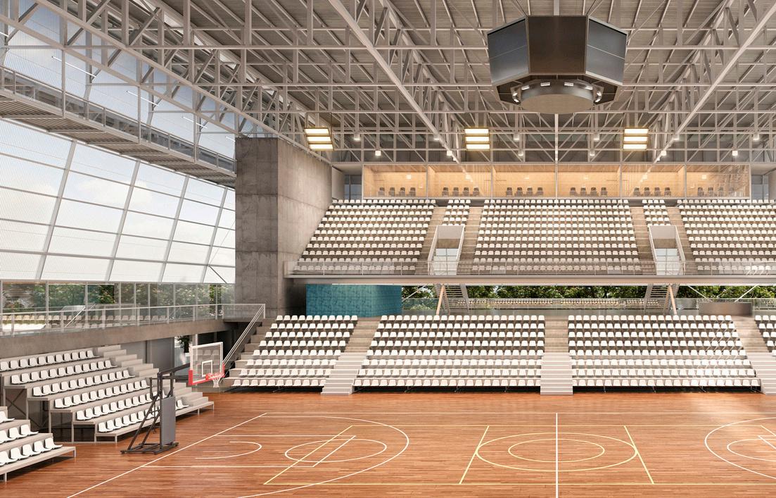 O embasamento do edifício abriga as entradas dos atletas, as instalações de apoio para jornalistas e outras salas técnicas.