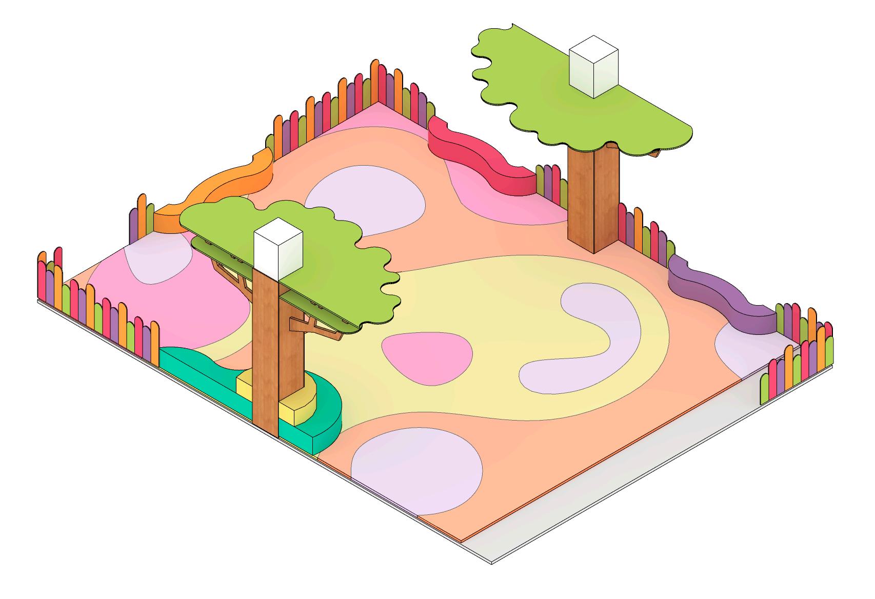 desenho de piso utilizado para setorizar de forma organica os diferentes brinquedos e idades recomendadas