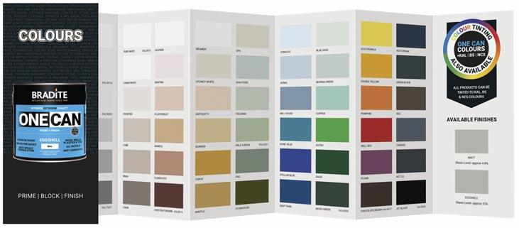 Protective coatings specialists, Bradite are making colour selection easier than ever with the launch of their first colour card. The card features a palette of shades available in their most-popular finish, One Can – a water-based primer, stain blocker and professional finish ‘all in one can’.