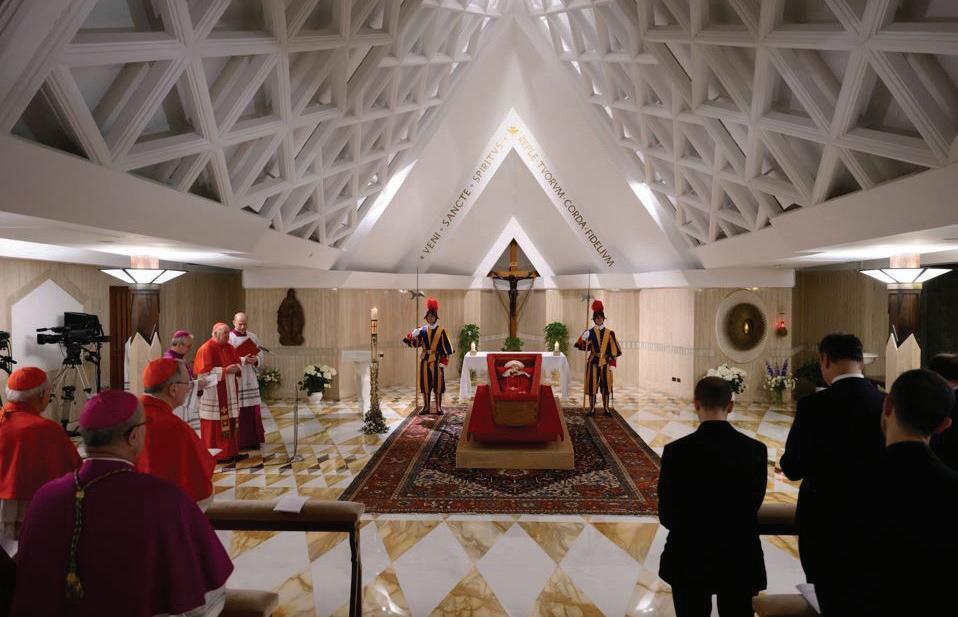 The mortal remains of Pope Francis on display in the Chapel of Casa Santa Marta, 昀anked by Swiss Guards holding vigil.