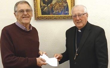 Middlesbrough Circle president Chris Rhodes and past president Paul Healy presented Bishop Terry with a cheque for £1,000 to help with transport costs.