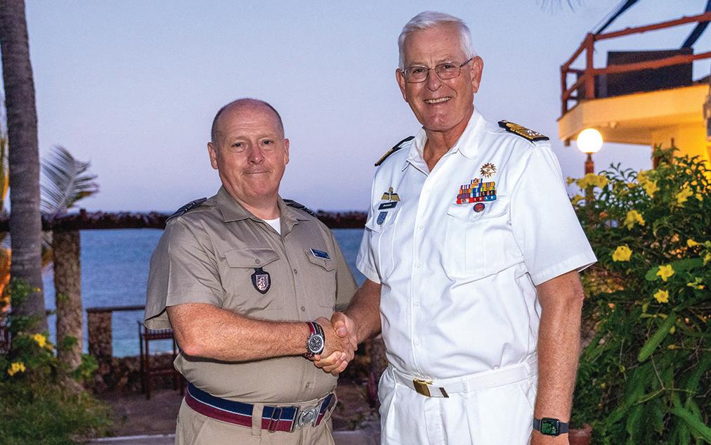 Reverend (Squadron Leader) Neil Galloway with the president of the AMI, Vice Admiral Matthieu Borsbloom of the Royal Netherlands Navy – Photo MOD Crown copyright Continued